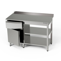 Masă de lucru din oțel inoxidabil cu dulap, sertar și 2 rafturi 120x70x85 cm | FORGAST