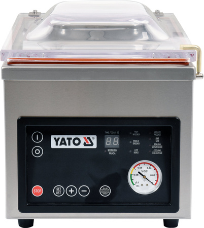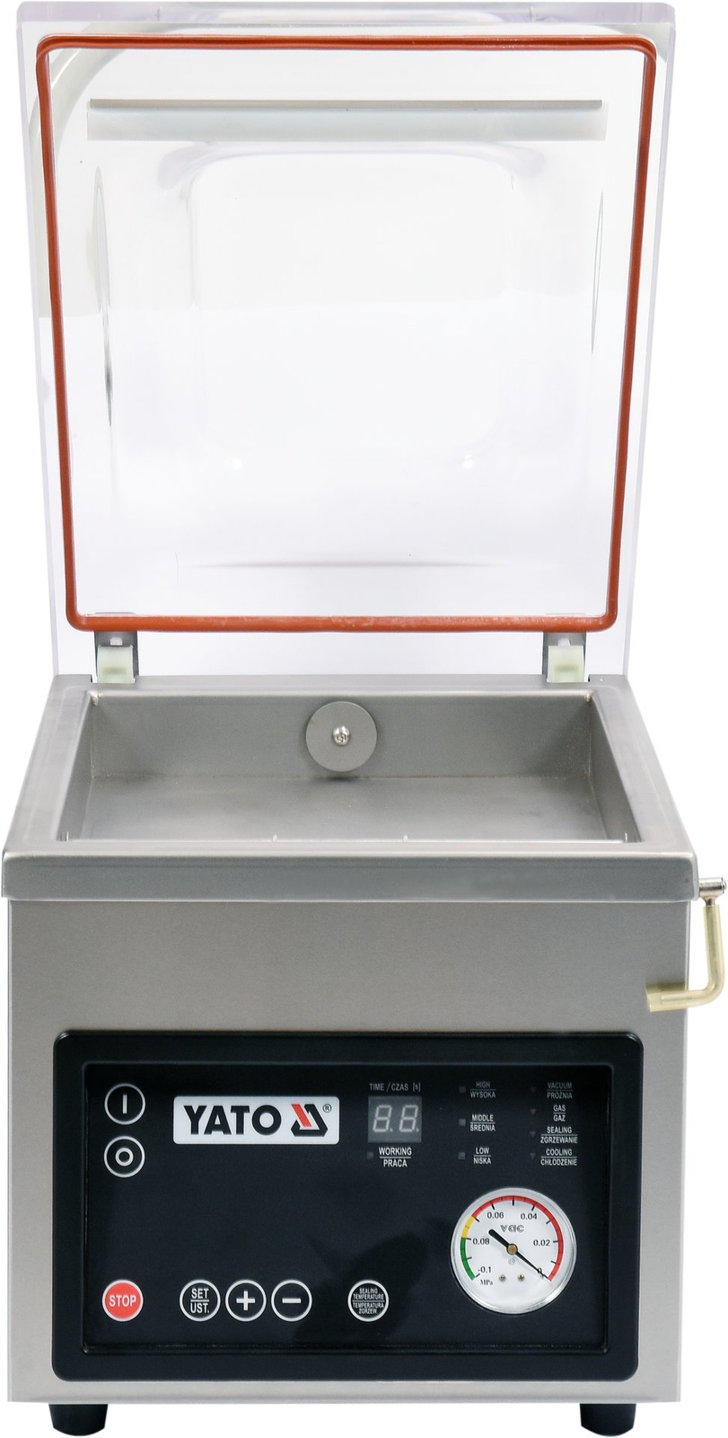 Pakeră de vid cu cameră marca YATO cu o lungime a barei de sudare de 26 cm. Permite ambalarea alimentelor în vid, ceea ce încetinește eficient procesele de oxidare și dezintegrării, garantând prospețime mai îndelungată. Produsele conservate pot fi păstrate în frigider-congelator pentru o perioadă lungă de timp, minimizând pierderile și eliminând necesitatea aruncării produselor neutilizate. Ambalarea în vid este ideală pentru marinarea alimentelor, deoarece eliminarea aerului face ca procesul de marinare să fie mai eficient, iar gustul preparatului mai intens.