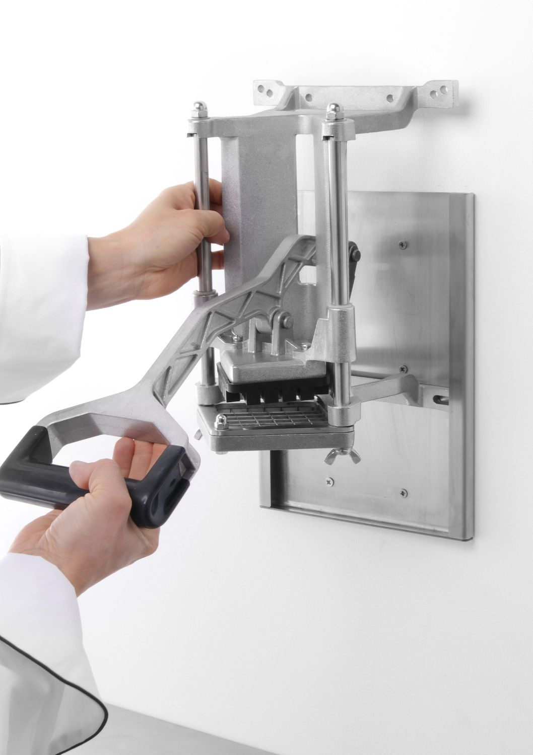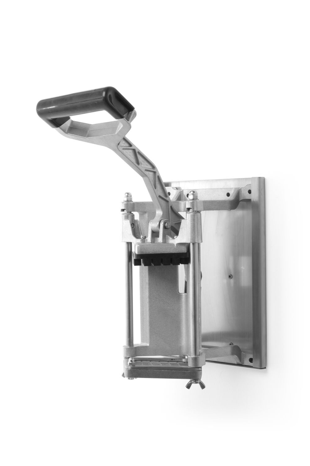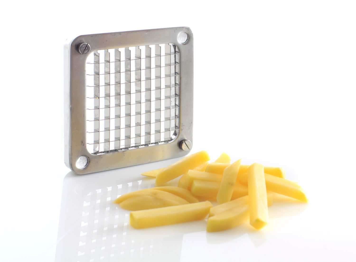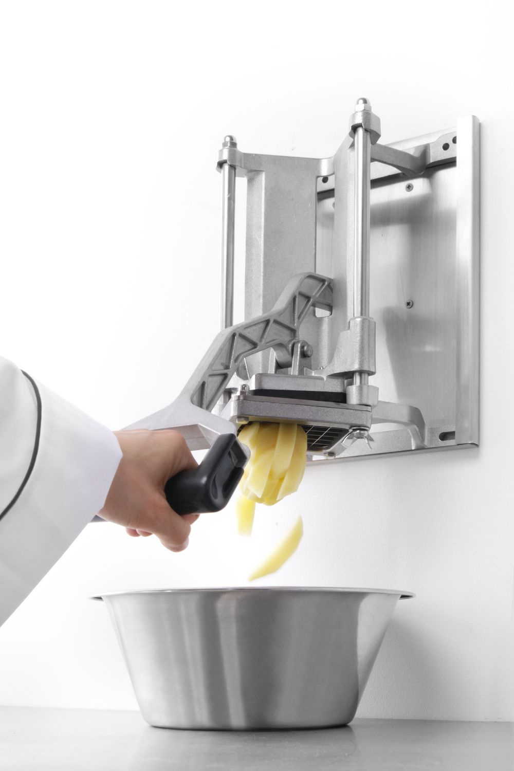 Feliator de cartofi din aluminiu, cu posibilitatea de montare pe perete sau blat. Include 3 grile: 6x6, 9x9, 13x13 mm și o lamă pentru tăierea în 8 bucăți.