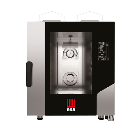 Mască neagră Millenial Gastro Cuptor combinat cu gaz. Pregătit pentru 7 tăvi GN 1/1. Cuptorul are un panou de control negru, de 7 inchi și sensibil la atingere, care dispare complet în ușa neagră atunci când este oprit.