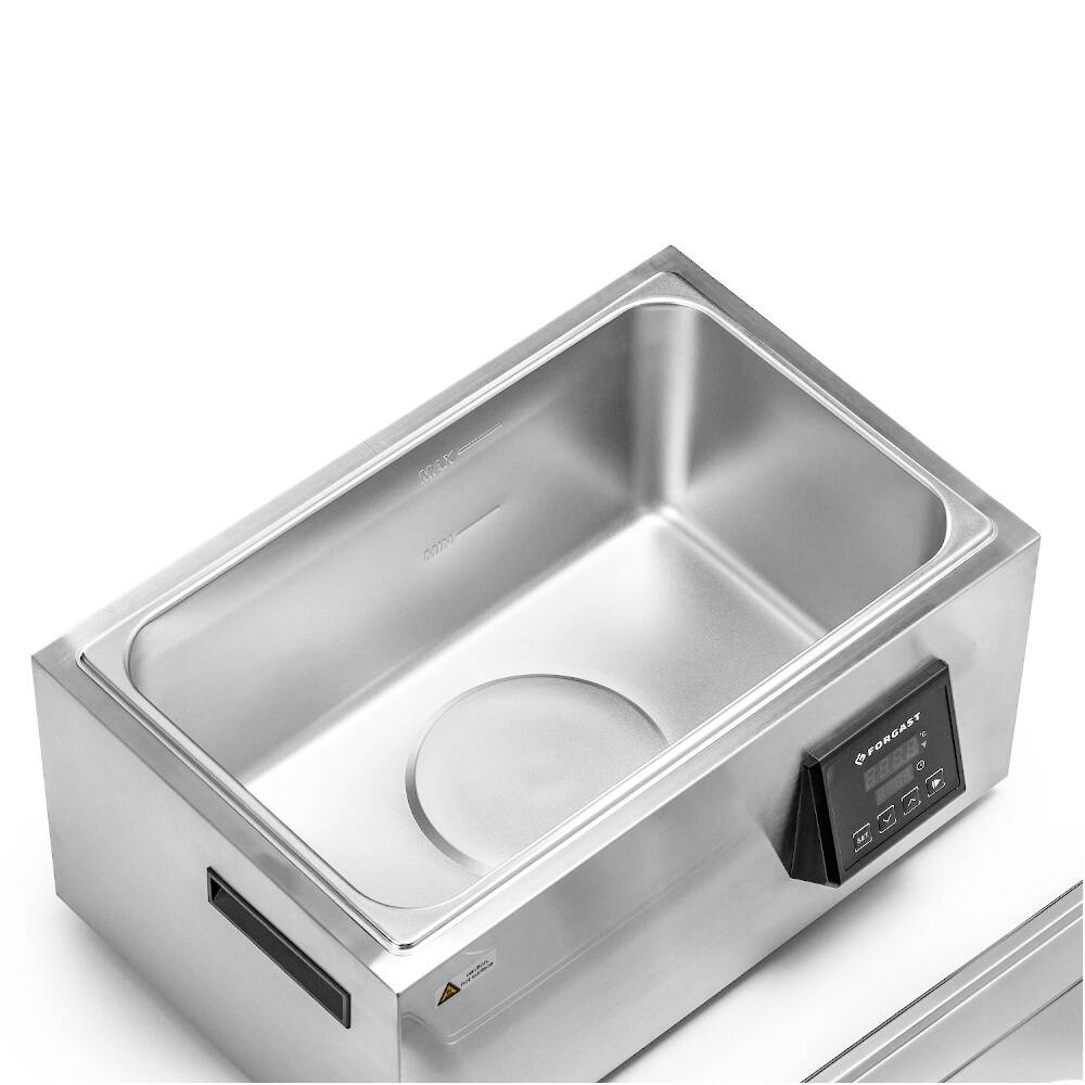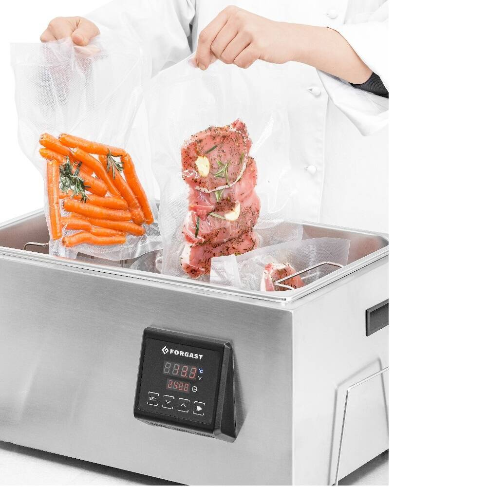 Circulatorul FORGAST bemar cu o capacitate de 28 litri a fost dezvoltat pentru profesioniștii care se așteaptă la fiabilitate și precizie. Unitatea are un rezervor încăpător fabricat din materiale de înaltă calitate, un panou de control precis cu setări de temperatură și timp și un sistem eficient de circulație a apei care garantează încălzirea uniformă a întregului conținut. Acest lucru permite prepararea alimentelor într-un mod reproductibil, menținând textura și gustul ideale. Un circulator bemar este inclus, în timp ce un suport pentru pungi este disponibil separat ca accesoriu.