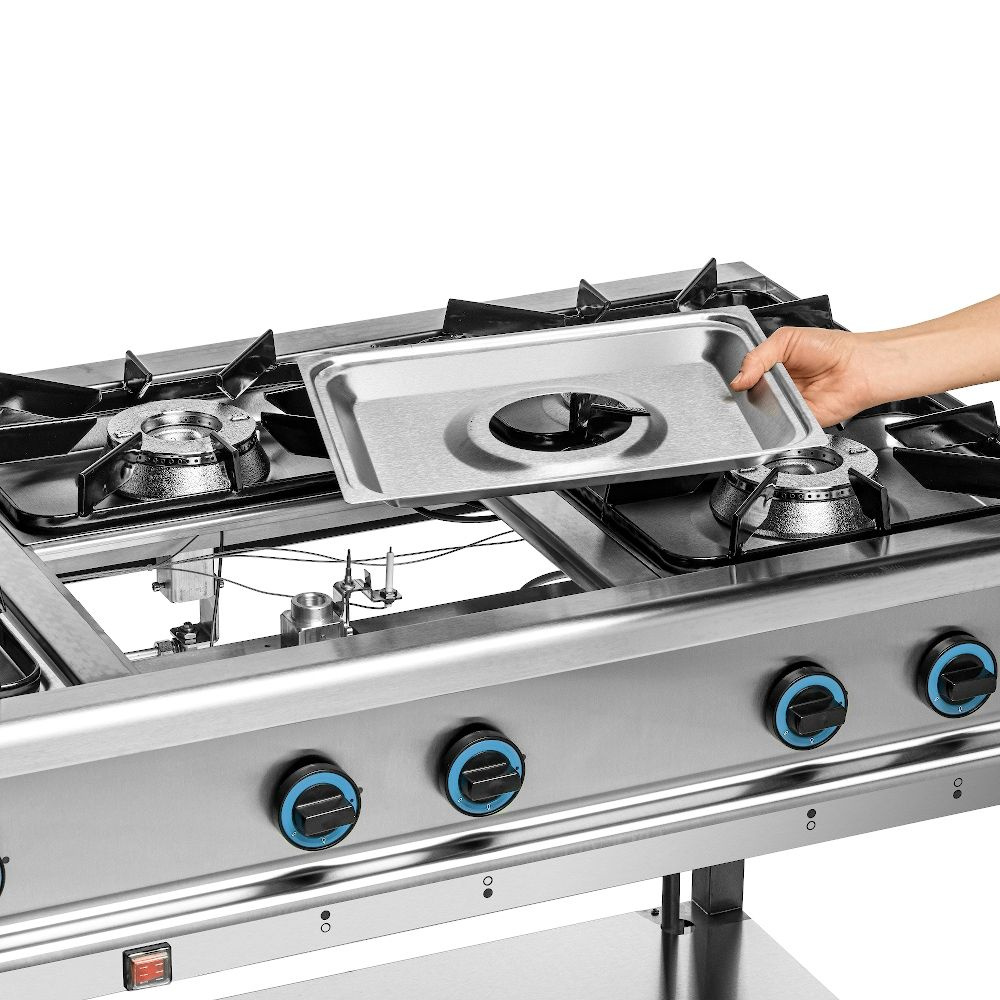 Aparatul este dotat cu tăvi din inox sub arzătoare, cu o capacitate de 0,5 litri fiecare. Această soluție facilitează colectarea și eliminarea reziduurilor, reducând semnificativ timpul de curățare după lucru. Tăvile pot fi spălate în mașina de spălat vase, ceea ce este deosebit de important în unitățile gastronomice unde igiena și rapiditatea curățeniei sunt cruciale. Datorită acestui fapt, aragazul FORGAST FG09456 este ideal pentru locuri cu volum mare de lucru, precum cantine sau bucătării hoteliere.