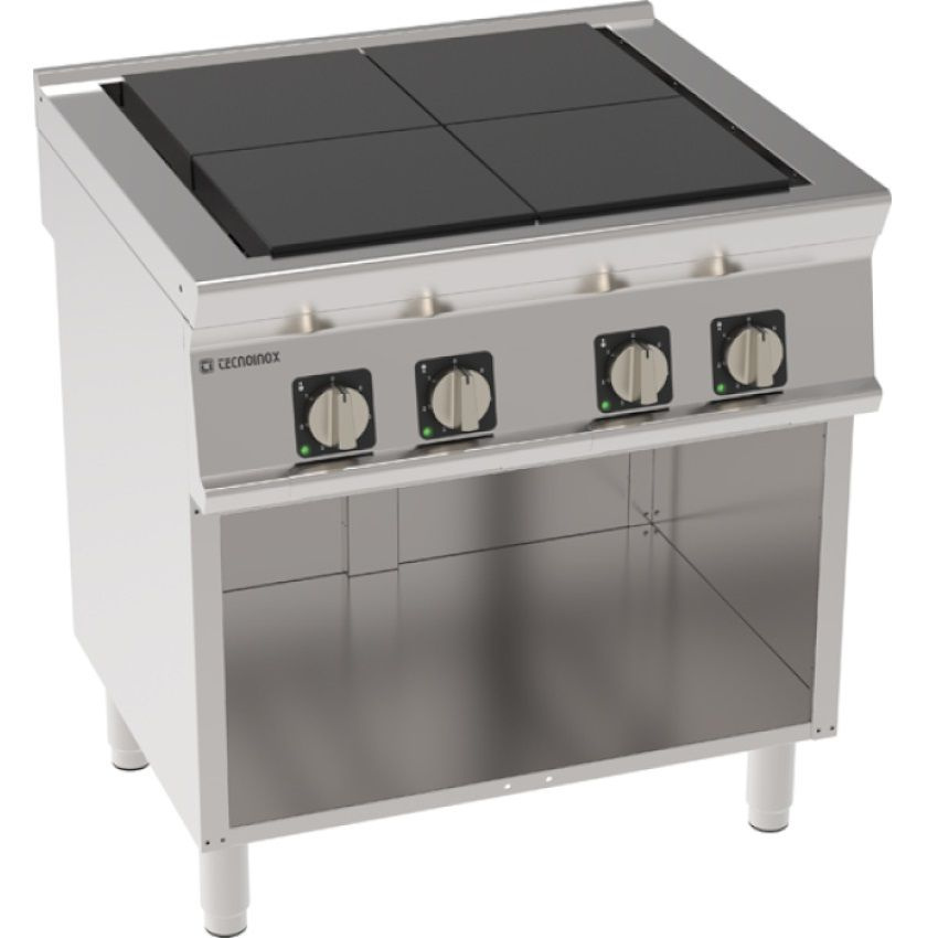 Model de bucătărie cu plită etanșă, blat turnat și placă turnată pentru o igienă mai bună. În plus, plăcile sunt pivotante coplanar pentru o manipulare mai ușoară. Dispozitivul are 6 niveluri de putere. Puterea zonelor de gătit este 4x3 kW. Dimensiunile plitei sunt 30x30 cm. În plus, există o bază deschisă sub aragaz cu dimensiuni interne 73x57,4x39,5 cm. Toate părțile bucătăriei, de la componente la materiale, sunt de origine europeană, iar rata de eșec depășește 99%. Cuptoarele electrice Tecnoinox nu sunt doar eficiente și funcționale, ci și design și robustețe într-unul singur, ideale pentru profesioniștii din catering.