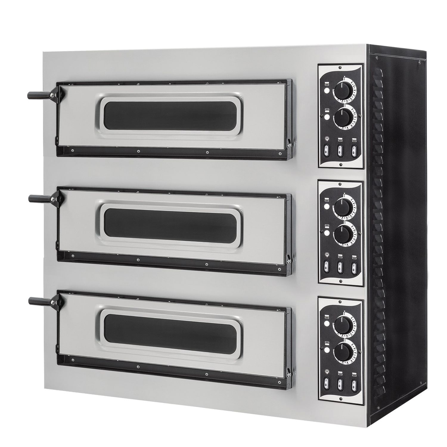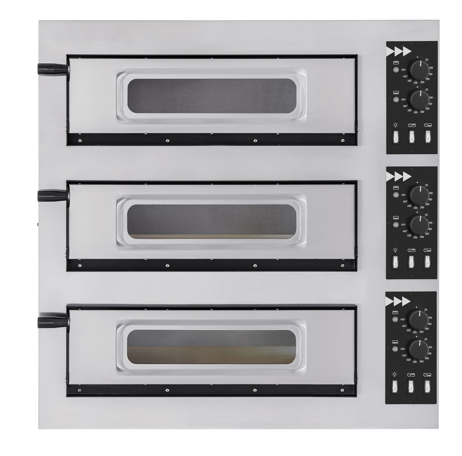 Cuptor electric pentru pizza cu 3 camere de la Prismafood. Poate coace simultan până la 3 tigăi de 60x40 cm sau 3 pizza cu un diametru de. 45 cm sau mai multe pizza mai mici. Cuptorul este ideal pentru pizzerii mari. Intervalul de temperatură al dispozitivului este cuprins între 45 și 455°C. Control manual separat pentru fiecare cameră. Există butoane separate pe panoul de control pentru a controla temperatura încălzitoarelor superioare și inferioare. 3 comutatoare permit pornirea iluminării camerei, a încălzitorului inferior sau a încălzitorului superior. Partea inferioară a camerei cuptorului este căptușită cu piatră chamotte pentru încălzirea rapidă și uniformă a camerei. Ușile vitrate ale fiecărei camere permit monitorizarea procesului de coacere. Carcasa cuptorului din oțel vopsit negru, fața și ușa din oțel inoxidabil.