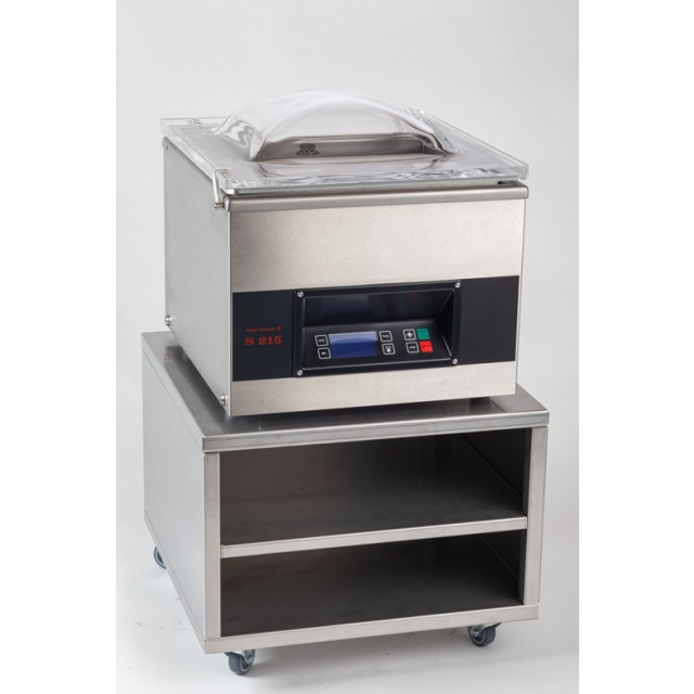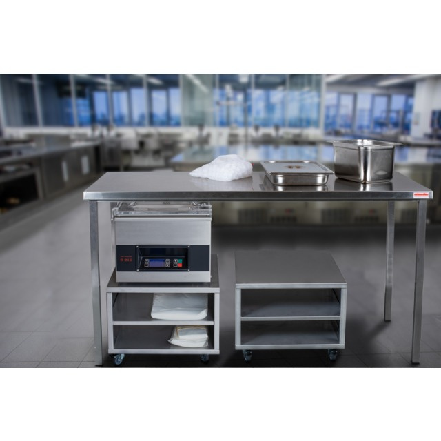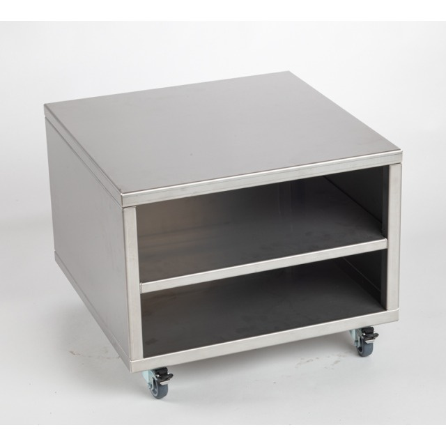 Baza este realizată integral din oțel inoxidabil de înaltă calitate (CNS), garantând durabilitate, rezistență la coroziune și ușurință în curățare. Construcția este echipată cu patru roți pivotante, dintre care două cu frâne, ceea ce permite deplasarea ușoară și asigură stabilitatea dispozitivului în timpul utilizării. Compartimentul încorporat oferă spațiu suplimentar pentru depozitarea accesoriilor, cum ar fi pungi de vid sau unelte.