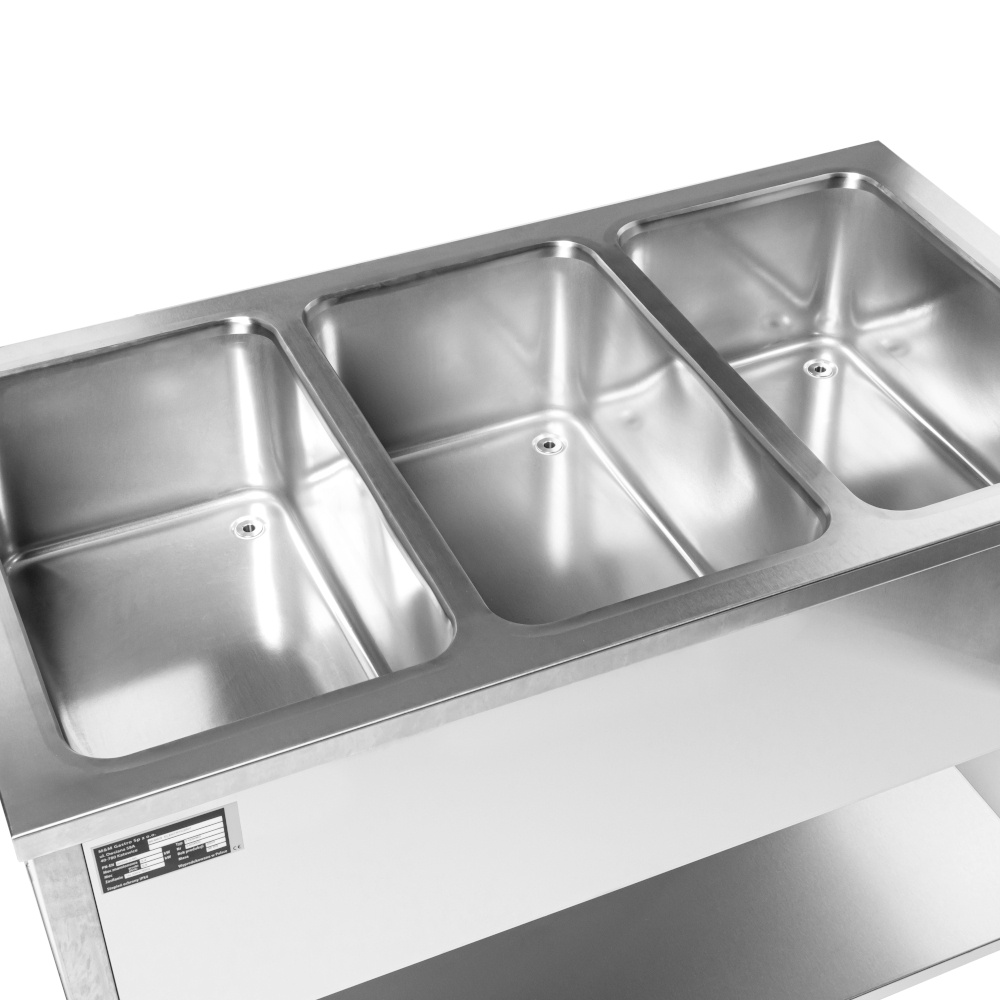 Unitatea este echipată cu trei compartimente independente potrivite pentru containerele GN 1/1 cu o adâncime de până la 20 cm. Datorită șinelor de susținere speciale, pot fi utilizate și containere GN mai mici, permițând flexibilitate în adaptarea la meniu și la numărul de feluri de mâncare care urmează să fie servite. Fiecare cameră are propriul control, astfel încât numai secțiunile selectate pot fi încălzite, economisind energie. Bemar este, de asemenea, echipat cu o supapă de scurgere convenabilă pentru golirea rapidă a apei și picioare reglabile pentru nivelare ușoară pe orice suprafață de lucru.