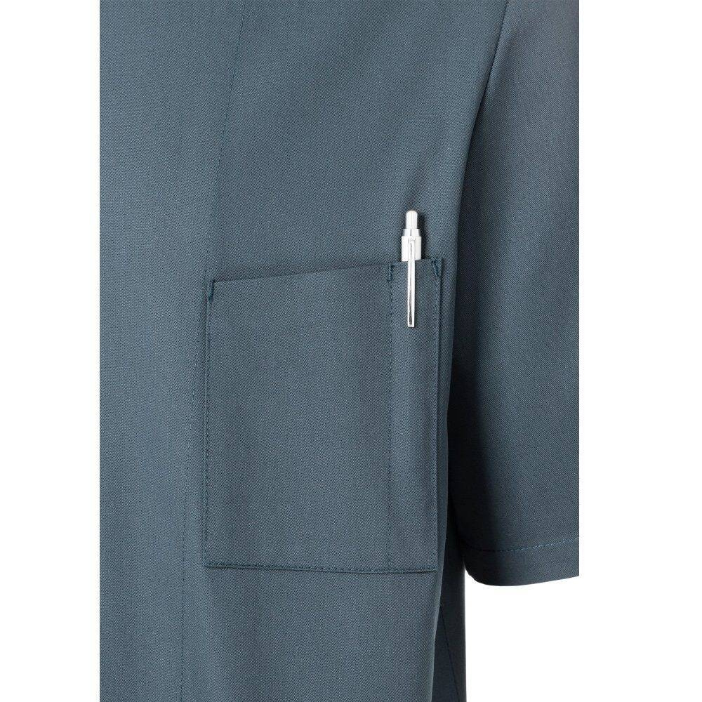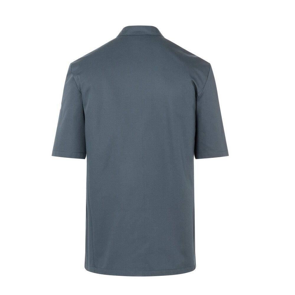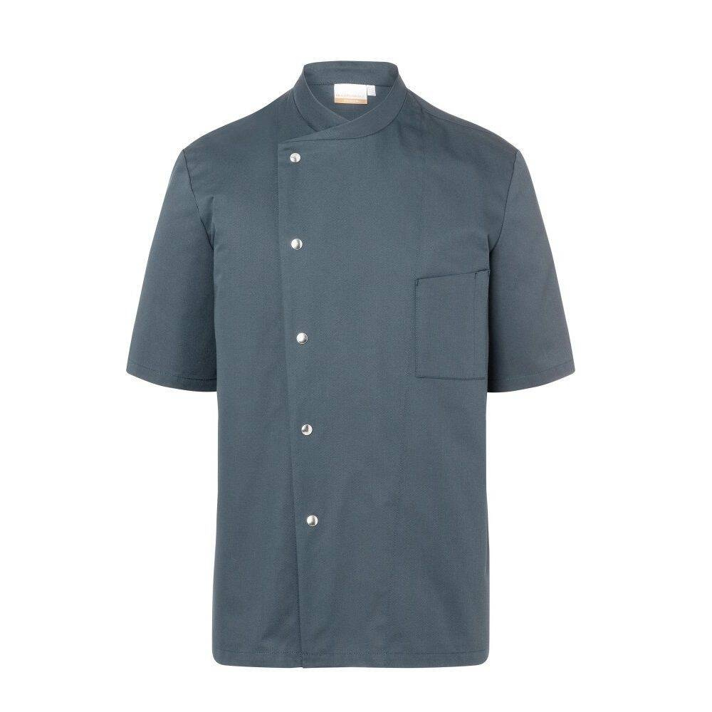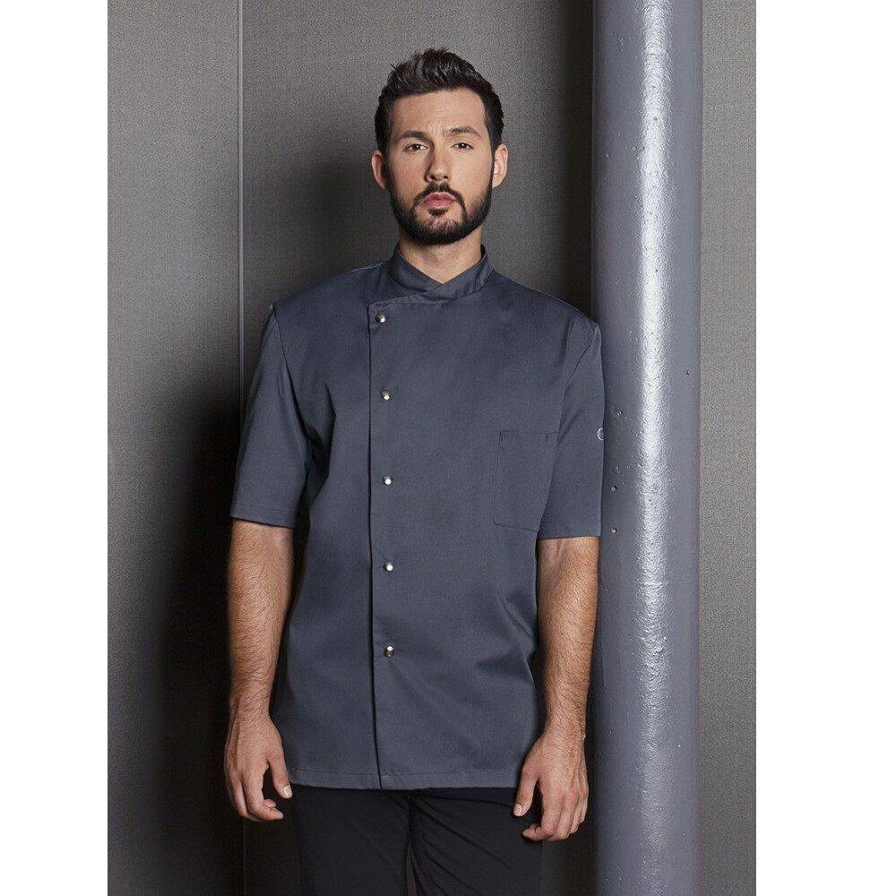 Bluză bărbătească de bucătar Gustav de la Karlowsky. Culoare antracit. Fabricată din 65% poliester și 35% bumbac. Țesătură diagonală. Bluză cu mâneci scurte, croială clasică. Pe pieptul stâng buzunar practic. Se închide cu 5 nasturi cu capse. Potrivită pentru spălare industrială, curățare chimică și înălbire. Disponibilă în mărimi de la 44 la 66.