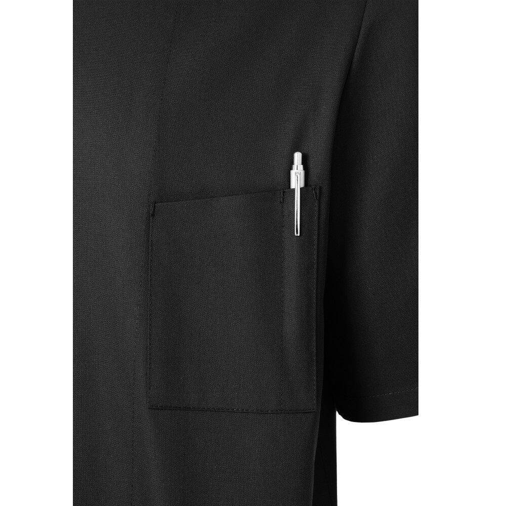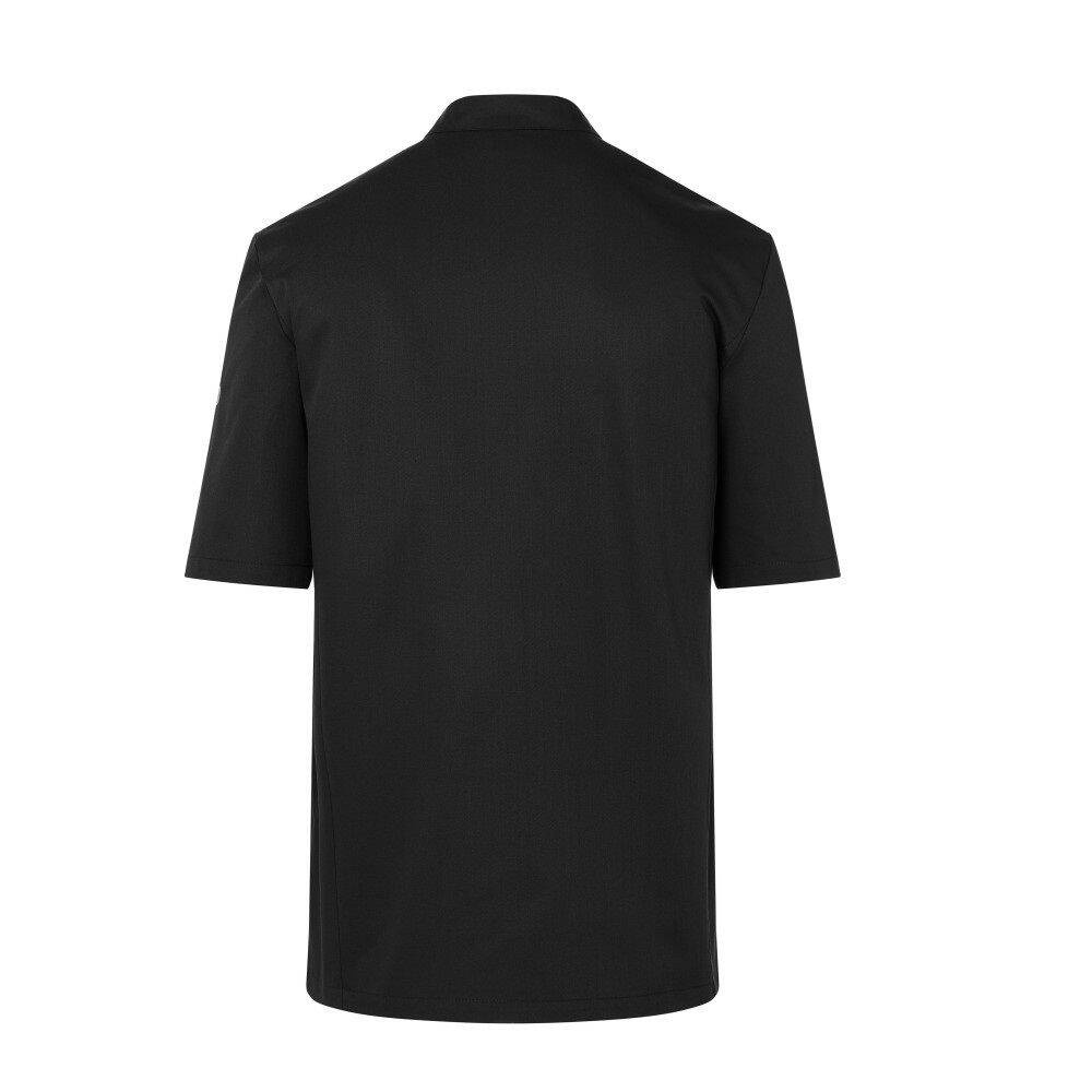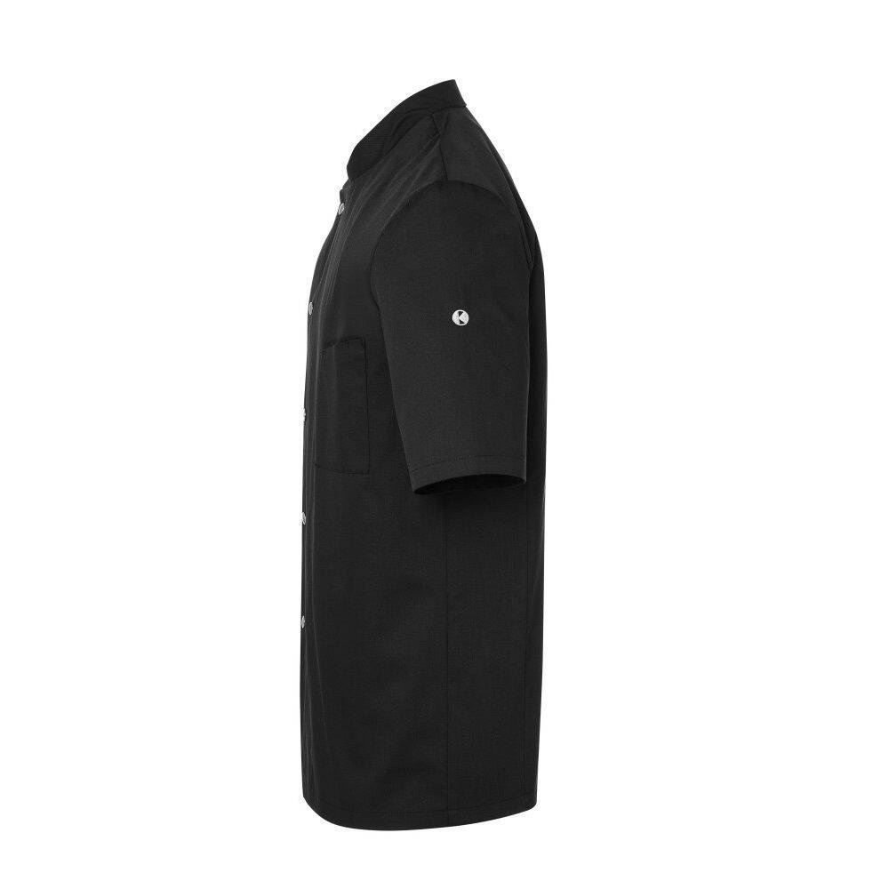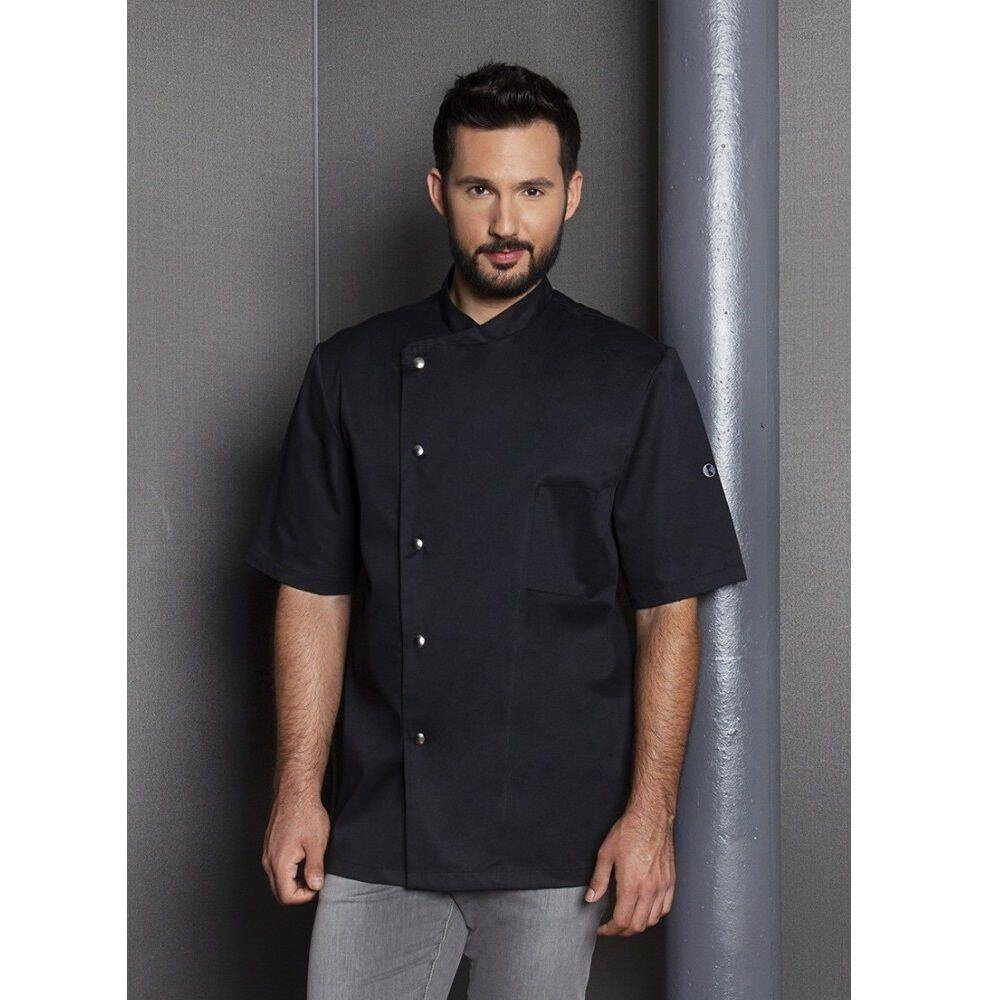 Bluză bărbătească de bucătar Gustav de la Karlowsky. Culoare neagră. Realizată din 65% poliester și 35% bumbac. Țesătură diagonală. Bluză cu mâneci scurte, croială regular. Buzunar practic pe pieptul stâng. Se închide cu 5 nasturi cu capse. Potrivită pentru spălare industrială, curățare chimică și albire. Disponibilă în mărimi de la 44 la 66.