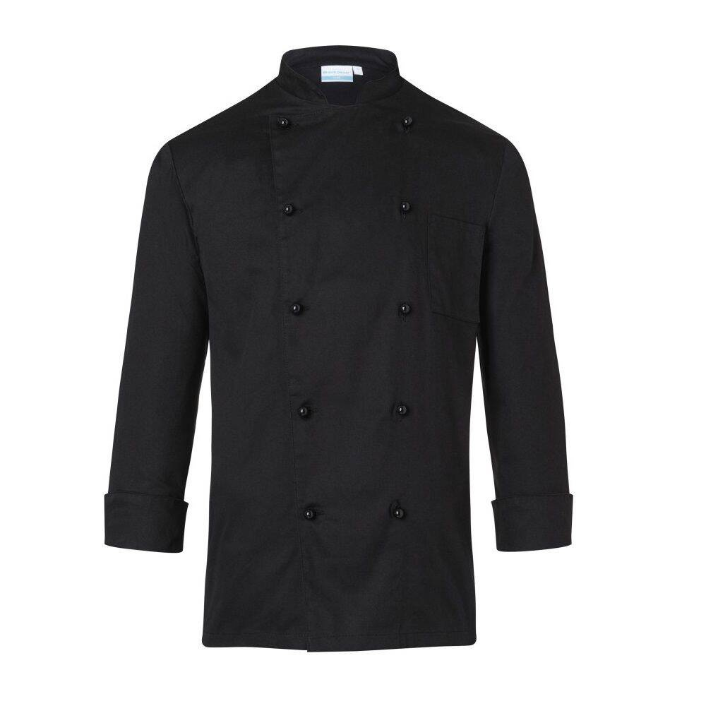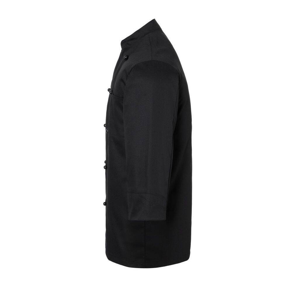 Bluză de bucătar Basic marca Karlowsky. Culoare neagră, unisex. Fabricată 100% din bumbac 185 g/m2. Țesătură diagonală. Bluza are o croială regulară și manșete cu deschidere. Pe partea stângă a pieptului este cusut un buzunar. Bluză cu două rânduri de nasturi, cu 10 nasturi negri. Se poate spăla la mașină și călca. Nu se recomandă uscarea în uscător și albirea. Mărimi disponibile de la XS până la 4XL.
