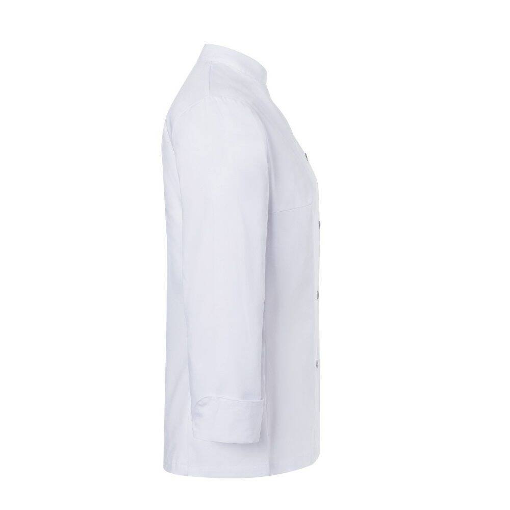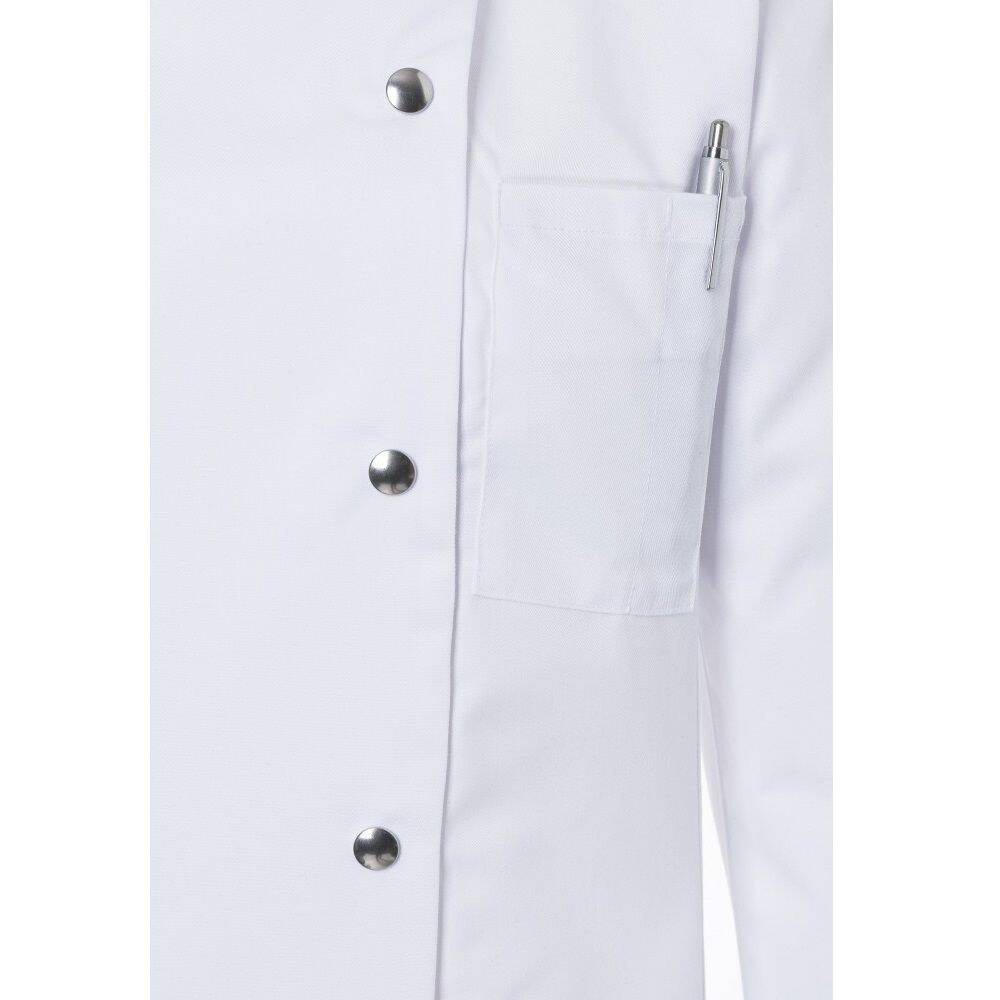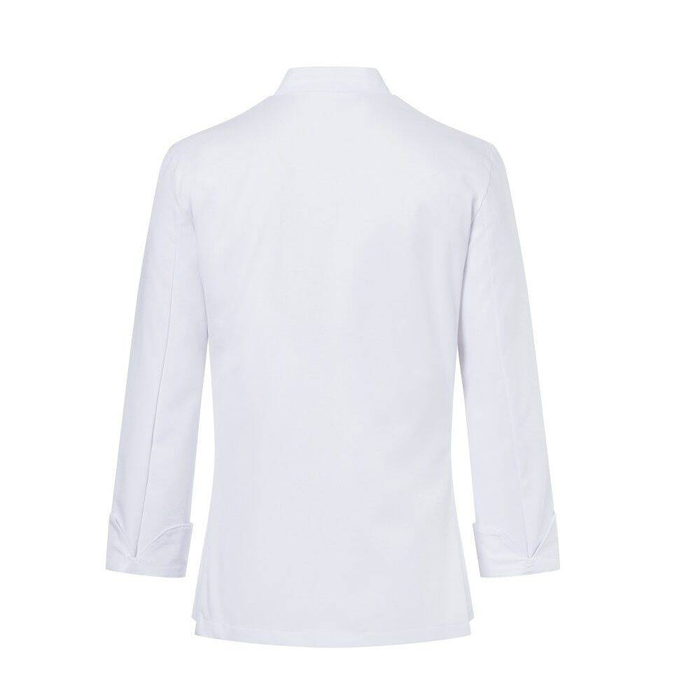 Bluză de bucătar pentru femei Larissa de la Karlowsky. Culoare albă. Realizată din 65% poliester și 35% bumbac. Țesătură diagonală. Bluză de bucătar cambrată, cu mâneci lungi. Croiala este asigurată de pense la bust și cusături laterale pe față și spate. Pe piept, în partea stângă, se află un buzunar. Bluza se închide cu 5 nasturi și capse. Poate fi spălată industrial și albita. Disponibilă în mărimi de la 34 la 50.