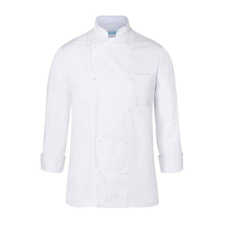 Tricou de bază pentru bucătari de Karlowsky. Alb, unisex. Fabricat din bumbac 100% 185 g/m2. Țesătură diagonală. Hanoracul are o croială regulată și manșete cu o crăpătură. Buzunar pe piept pe partea stângă. Bluză cu două rânduri de nasturi cu 10 nasturi albi. Se poate spăla la mașină și se poate călca. Nu se usucă cu tambur sau înălbitor. Mărimi disponibile de la XS la 4XL