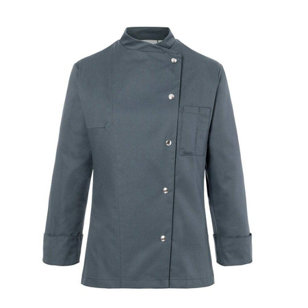 Hanorac pentru femei Larissa chef de Karlowsky. Culoare antracit. Fabricat din 65 % poliester și 35 % bumbac. Țesătură diagonală. Bluză ajustată de bucătar cu mâneci lungi. Potrivirea este asigurată de darts pe bust și cusături laterale pe partea din față și din spate a hanoracului. Există un buzunar pe partea stângă a pieptului. Hanoracul este fixat cu 5 nasturi și butoniere. Se poate spăla și înălbeni industrial. Mărimi disponibile de la 34 la 50.