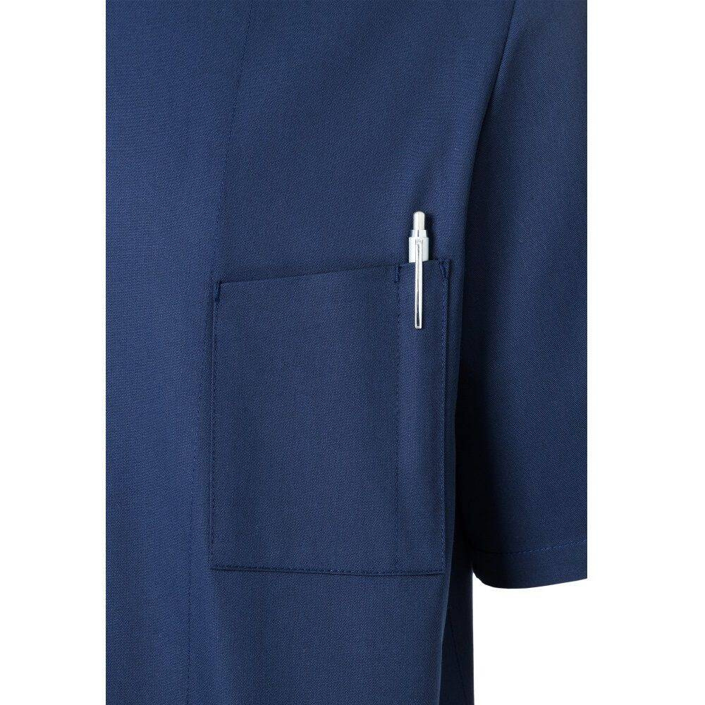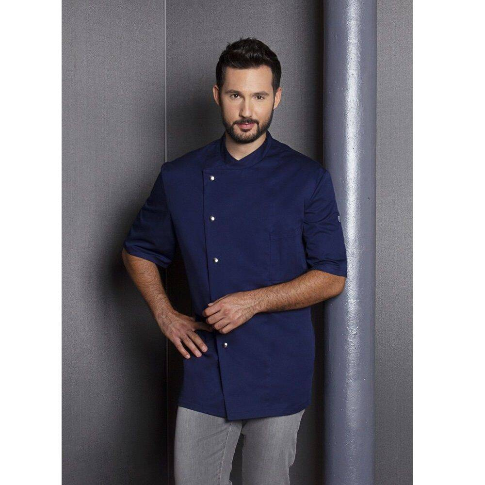 Bluză bărbătească de bucătar Gustav de la Karlowsky. Culoare bleumarin. Fabricată din 65% poliester și 35% bumbac. Țesătură diagonală. Bluză cu mâneci scurte, croială regulată. Buzunar practic pe partea stângă a pieptului. Se închide cu 5 nasturi cu capse. Potrivită pentru spălare industrială, curățare chimică și albire. Disponibilă în mărimi de la 44 la 66.