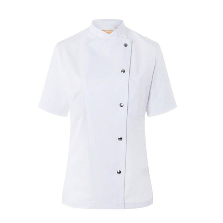 Tricou pentru femei Greta chef de Karlowsky. Culoare albă. Fabricat din 65 % poliester și 35 % bumbac. Țesătură diagonală. Bluză ajustată de bucătar cu mâneci scurte. Potrivirea este asigurată de darts pe bust și cusături laterale pe partea din față și din spate a hanoracului. Există un buzunar pe partea stângă a pieptului. Hanoracul este fixat cu 5 nasturi și butoniere. Lavabil industrial. Nu înălbiti. Mărimi disponibile de la 34 la 50.