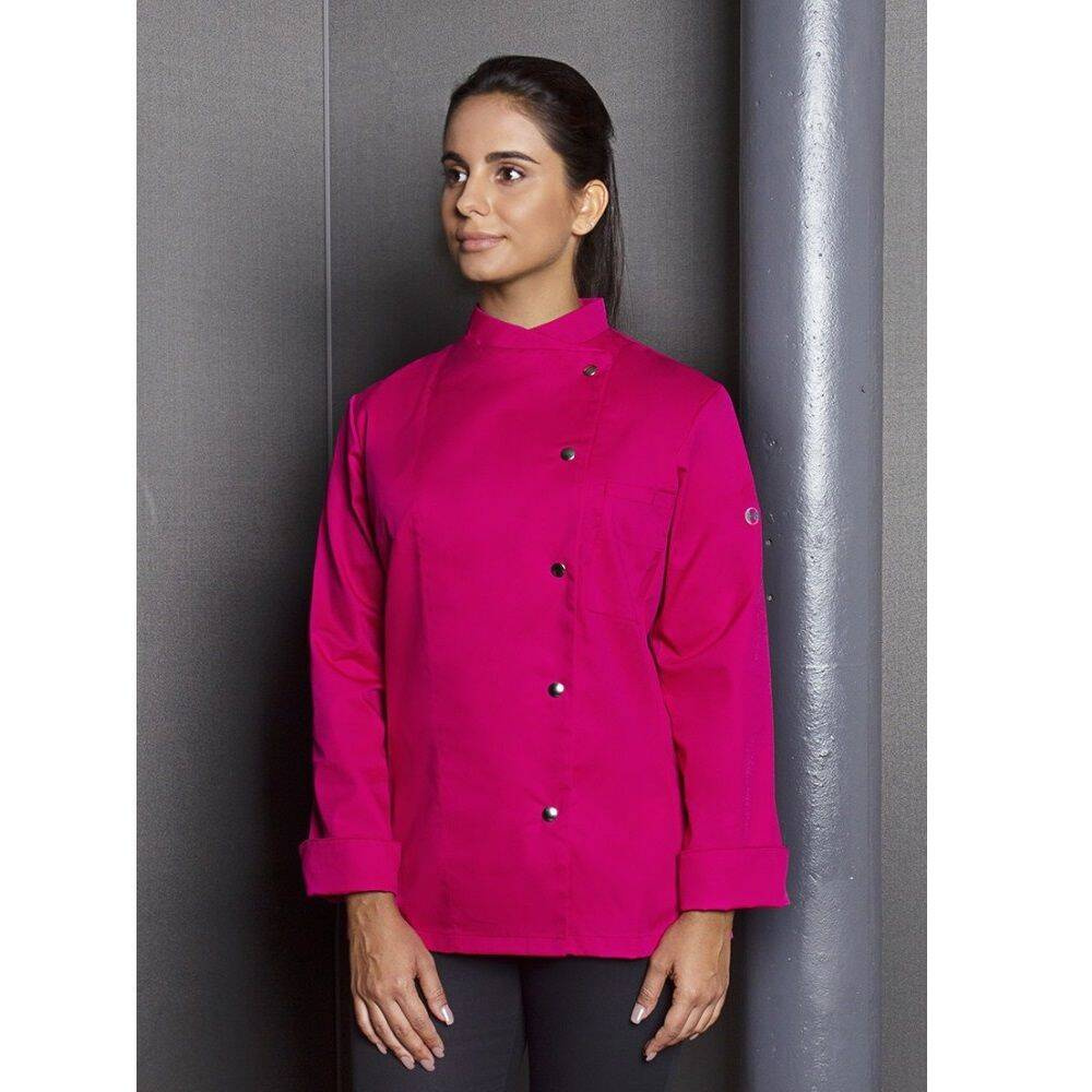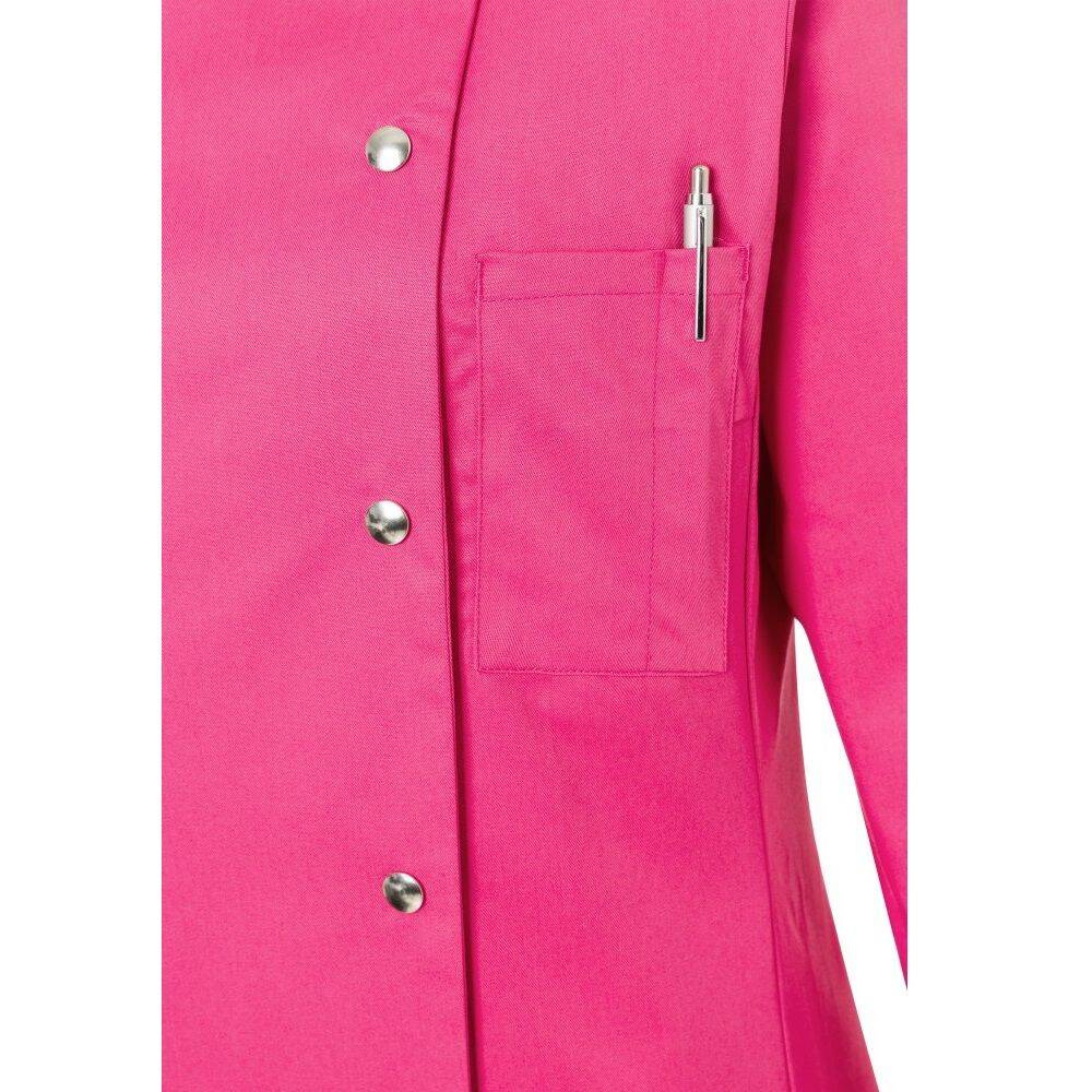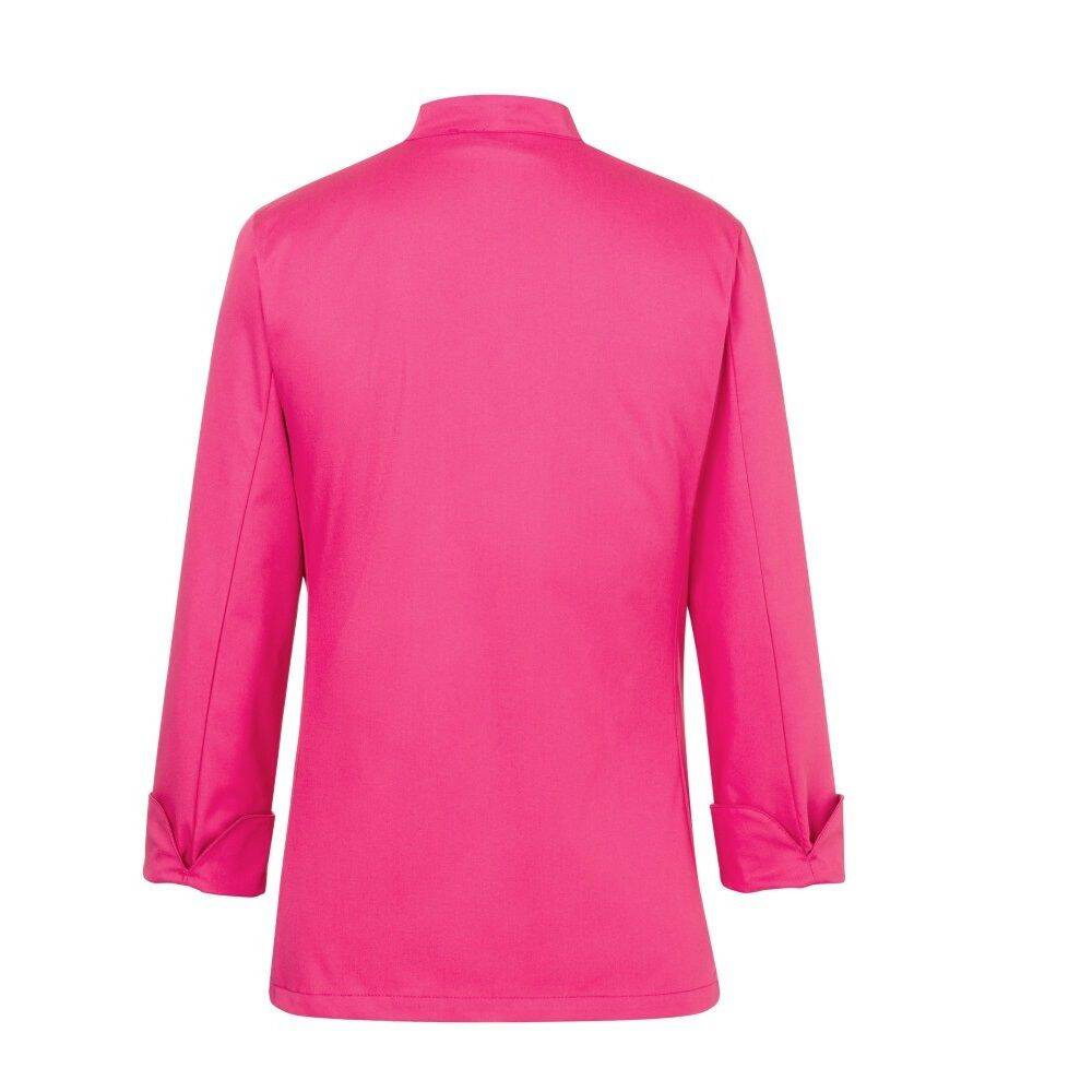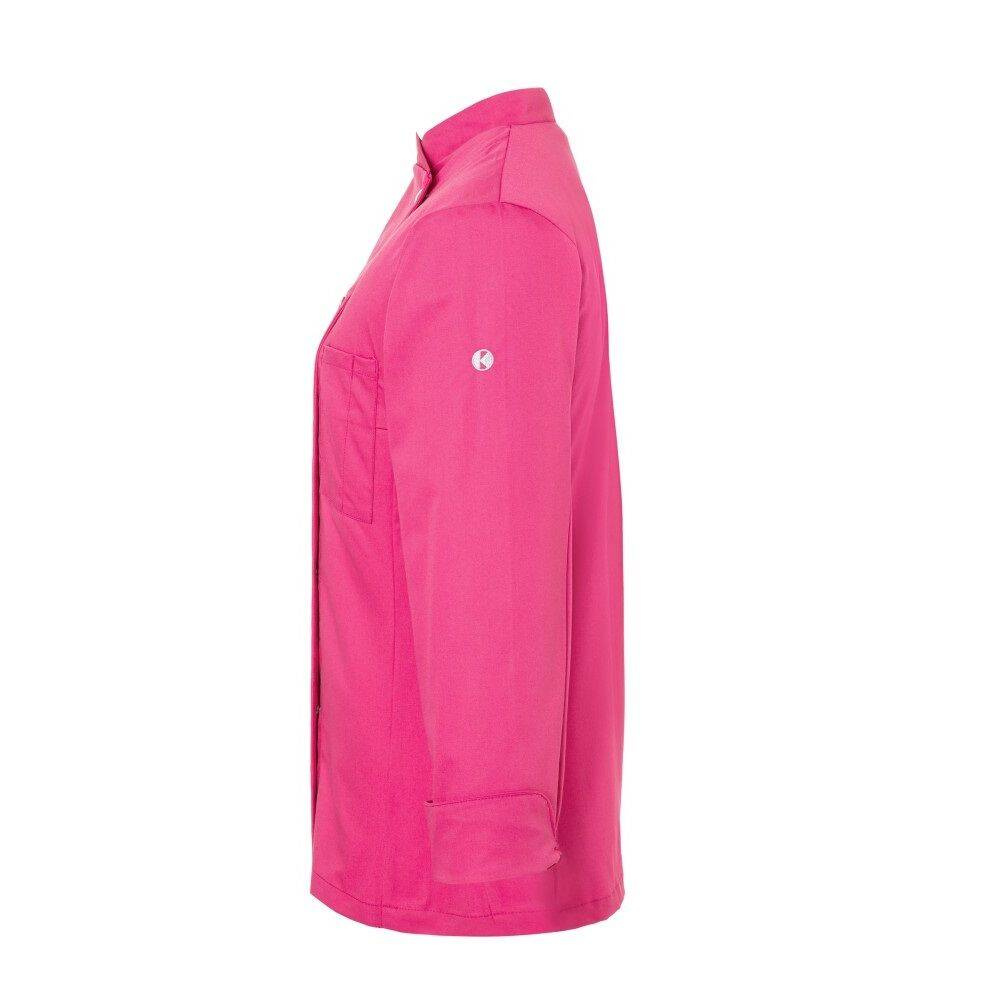 Bluză de bucătar pentru femei Larissa de la Karlowsky. Culoare roz. Realizată din 65% poliester și 35% bumbac. Țesătură diagonală. Bluză de bucătar cambrată cu mâneci lungi. Croiala este evidențiată prin pense la bust și cusături laterale pe față și pe spate. Pe partea stângă a pieptului există un buzunar. Bluză se închide cu 5 nasturi și capse. Poate fi spălată industrial și albita. Disponibilă în mărimi de la 34 la 50.