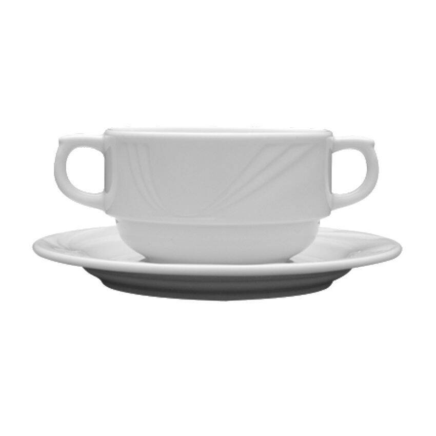 Bolul pentru supă cu toarte Lubiana Arcadia 320 ml LUBIANA 0517 este un vas elegant realizat din porțelan de înaltă calitate. Produsul se remarcă prin designul său clasic cu reliefuri subtile și toarte comode, care facilitează servirea supelor, a bulionului sau a cremelor fierbinți. Este o alegere excelentă atât pentru utilizarea zilnică, cât și pentru ocazii speciale – în restaurante, hoteluri sau la mesele de acasă.