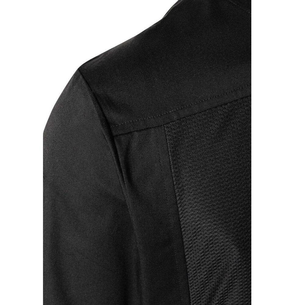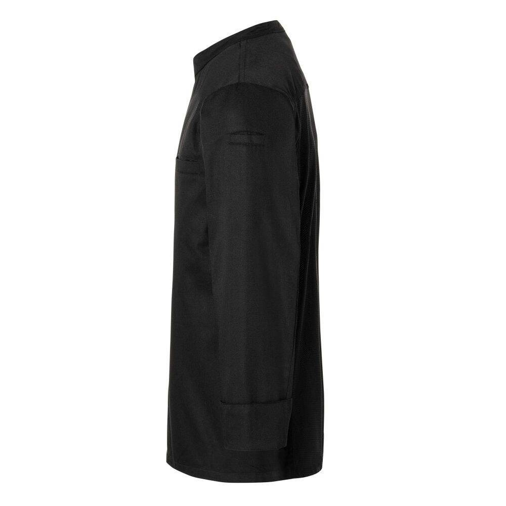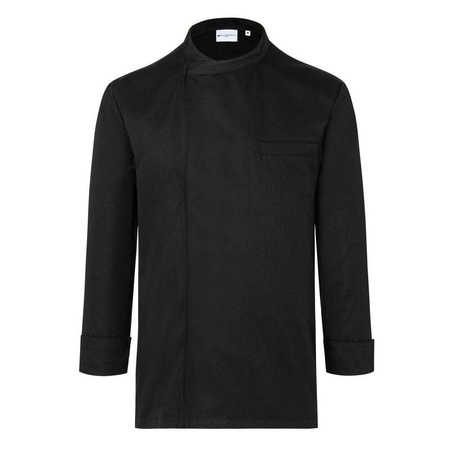 Cămașă de bucătar Basic cu mânecă lungă marca Karlowsky. Culoare neagră. Realizată din 35% bumbac și 65% poliester. Partea din față – țesătură diagonală. Partea din spate realizată din material tip jerseu (structură tip plasă). Cămașa are croială simplă și închidere ascunsă cu nasturi. Pe piept, în partea stângă, există un buzunar aplicat cu bandă elastică. Potrivită pentru spălare la mașină și călcare. Nu se recomandă uscarea în uscător și albirea. Mărimi disponibile de la XS până la 3XL