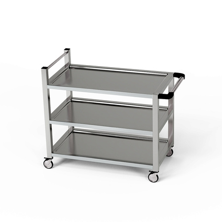 Cărucior pentru ospătari cu 3 rafturi 100x60x85 cm sudate cu mâner mixt din oțel inoxidabil J4.