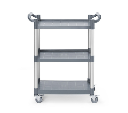 Carucior cu 3 rafturi din material plastic pentru asamblare proprie. Sarcina maximă pe raft este de 50 kg, cu greutatea distribuită uniform. Construcție ușoară. 4 roți pivotante, dintre care 2 cu frână. Distanța între rafturi este de 34 cm.