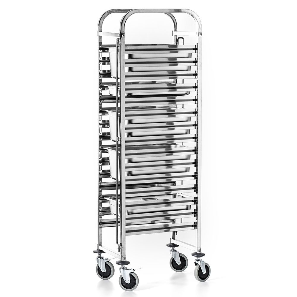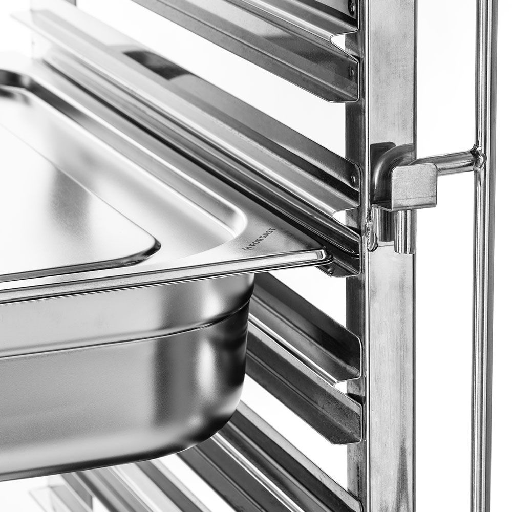 - Capacitate: 15 recipiente GN 1/1 – permite transportul simultan al unui număr mare de recipiente, ceea ce crește semnificativ eficiența muncii în bucătărie.