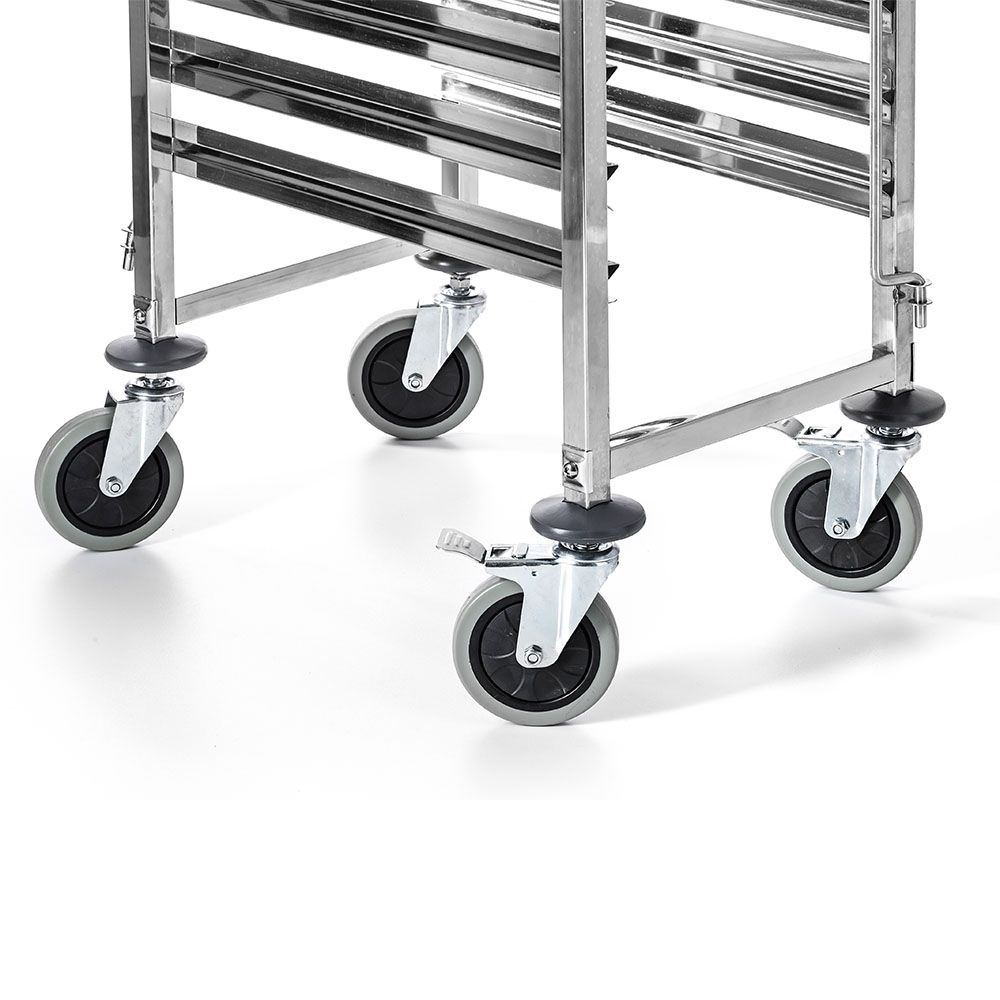 Setul conține toate elementele necesare pentru asamblare de către utilizator, ceea ce permite pregătirea rapidă a căruciorului pentru utilizare. Cele patru roți pivotante, dintre care două cu frâne, asigură manevrarea facilă chiar și în spații aglomerate și poziționarea stabilă în timpul încărcării sau descărcării recipientelor GN.