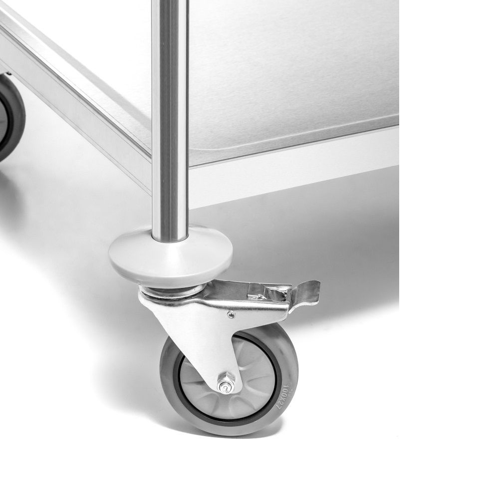 • Oțel inoxidabil – Caruciorul este realizat integral din oțel inoxidabil de calitate superioară, asigurând durabilitate, rezistență la coroziune și ușurință în întreținerea curățeniei, chiar și în condiții de utilizare intensă în medii gastronomice.