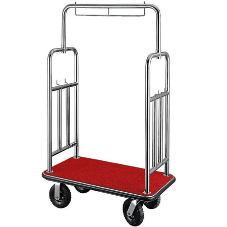 Cărucior pentru bagaje fabricat din oțel inoxidabil, pe roți cu diametrul de 200 mm, cu bare de protecție din cauciuc, iar suprafața de transport este căptușită cu material roșu. Produs livrat pe un palet.