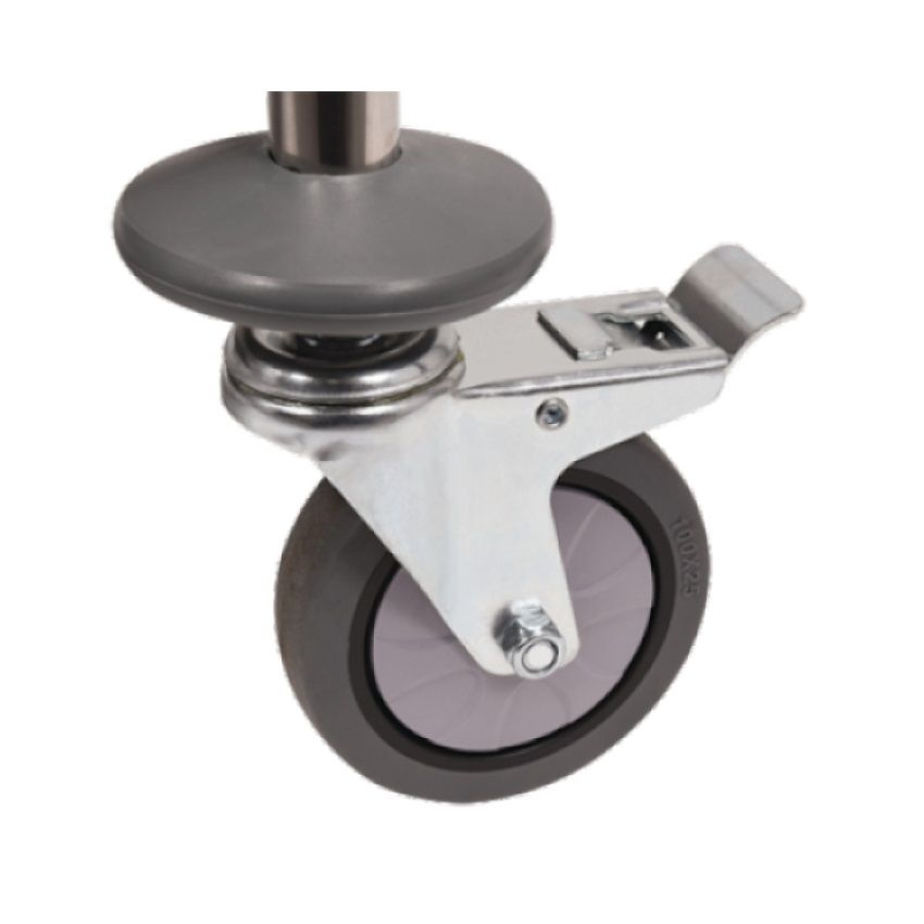 Ghidajele special concepute în formă de L, distanțate la intervale de 80 mm, asigură poziționarea stabilă a tăvilor și foilor, oferind în același timp o suprafață mare pentru produsele transportate. Căruciorul are 4 roți cu rulmenți, fabricate din TPR gri de înaltă calitate. Datorită utilizării acestui material dur, dar flexibil, rotilele funcționează foarte silențios și nu zgârie podeaua. De asemenea, acestea sunt pivotante la 360°, permițând manevrarea ușoară chiar și în camere greu accesibile și coridoare înguste. În plus, 2 dintre aceste roți sunt echipate cu frâne, ceea ce sporește controlul căruciorului în timpul operațiunilor de încărcare și descărcare. Siguranța transportului este asigurată prin încuietori speciale pe ambele părți ale căruciorului.