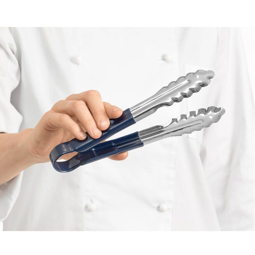 Clestele este fabricat din oțel inoxidabil de înaltă calitate, ceea ce îi conferă rezistență la utilizare intensivă și spălări frecvente în mașina de spălat vase. Mânerul ergonomic acoperit cu material plastic rezistent, de culoare albastră, asigură o prindere fermă chiar și atunci când se lucrează cu mănuși sau în condiții umede. Cleștele este universal – perfect pentru servirea preparatelor pe linii de autoservire, la bufete, dar și pentru pregătirea mâncărurilor în bucătării hoteliere sau de restaurant. Produsul nu conține accesorii suplimentare – în set se află o singură pereche de clești.