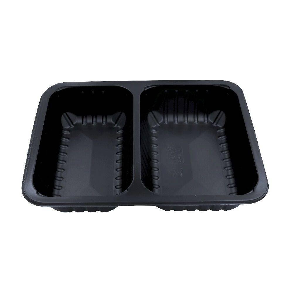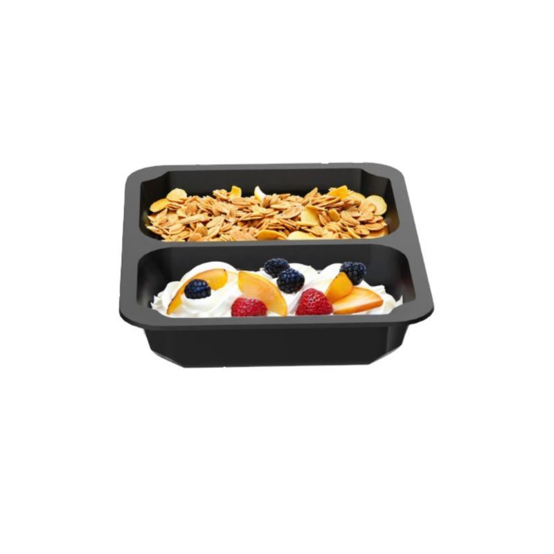Recipient alimentar cu 2 compartimente, cu dimensiunile 22,7x17,8x5 cm, destinat preparatelor la pachet. Recipientul este fabricat din polipropilenă neagră, reciclabilă. Proiectat pentru termosigilarea preparatelor la pachet în aparate de sigilat.