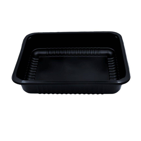 Recipient de mâncare nedelimitat cu dimensiunile 22,7x17,8x5 cm pentru preparate la pachet. Recipientul este realizat din polipropilenă neagră reciclabilă. Conceput pentru sigilarea termică a preparatelor la pachet în aparate de termosigilare.