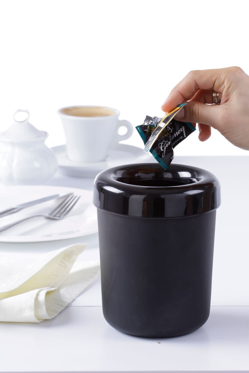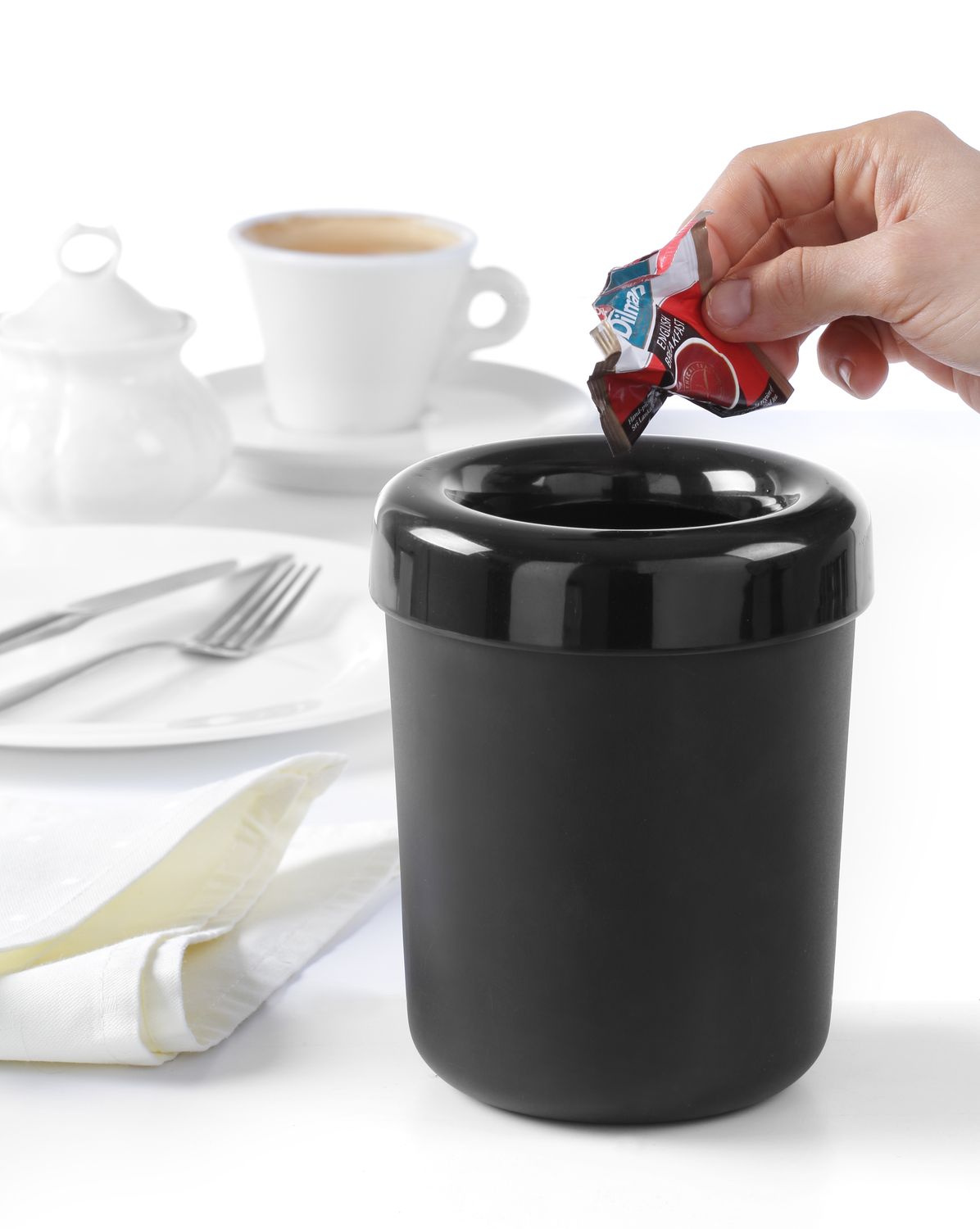 Coș de gunoi de masă care poate fi folosit și ca recipient pentru tacâmuri. De culoare neagră, realizat din material plastic.