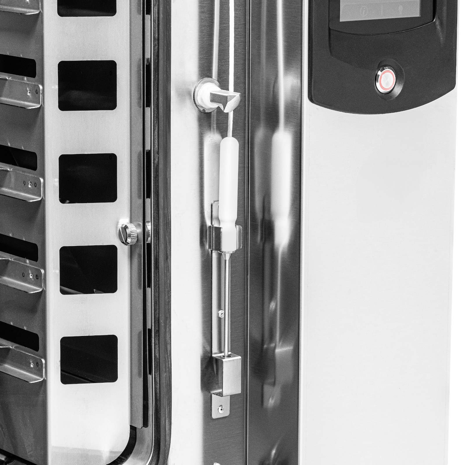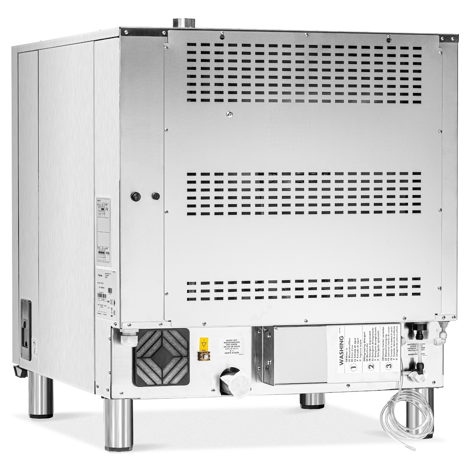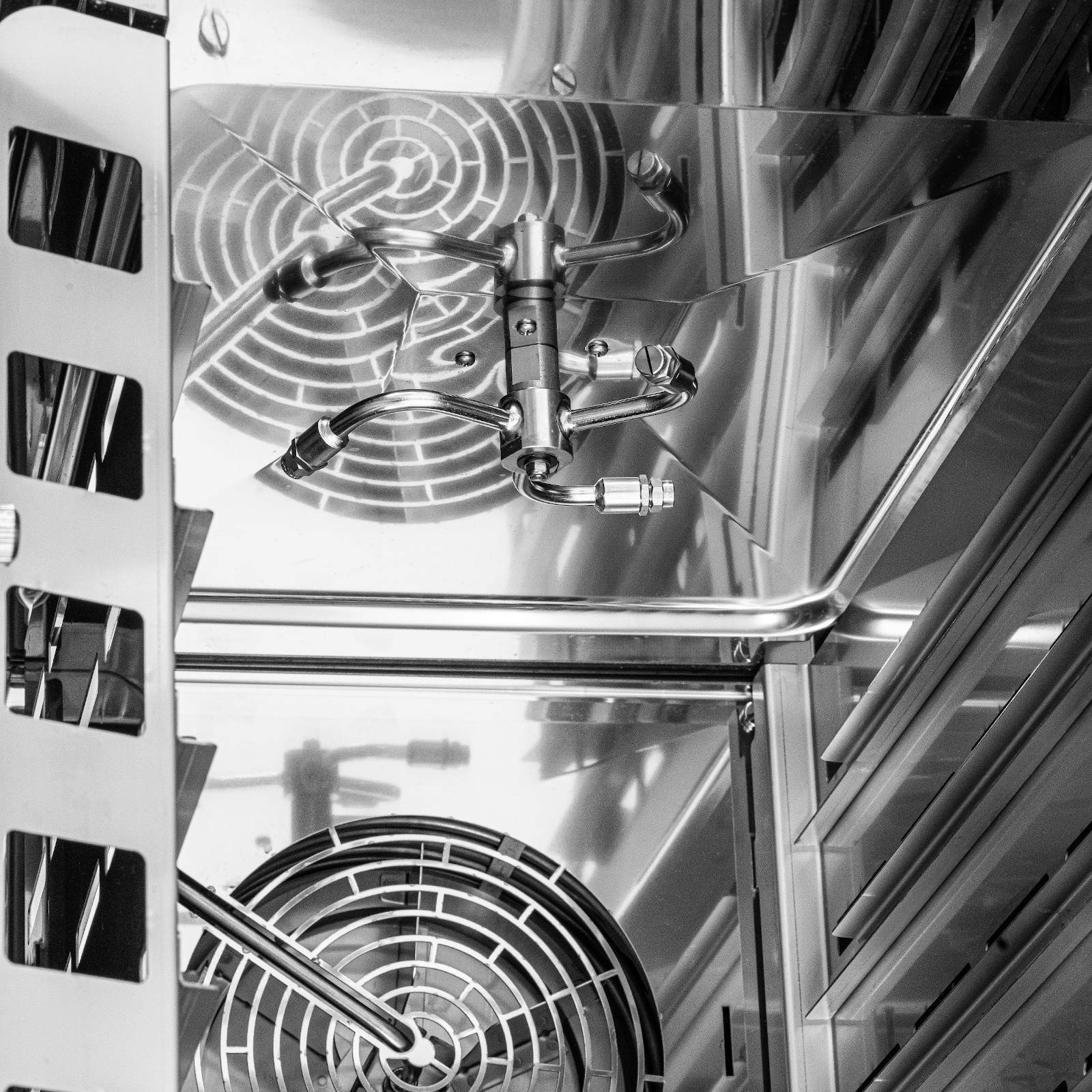 Aparatul este fabricat din oțel inoxidabil de înaltă calitate AISI 304, asigurând rezistență la coroziune și ușurință în curățare. Camera cu interior embosat și colțuri rotunjite permite spălarea rapidă, iar scurgerea de la bază elimină eficient surplusul de lichide. Ușa cu geam dublu și răcire gravitațională crește siguranța și confortul în utilizare, minimizând riscul de arsuri. Cuptorul este echipat cu un sistem automat de răcire a camerei, permițând schimbarea rapidă și sigură a modului de funcționare, precum și port USB pentru actualizarea software-ului și gestionarea rețetelor.