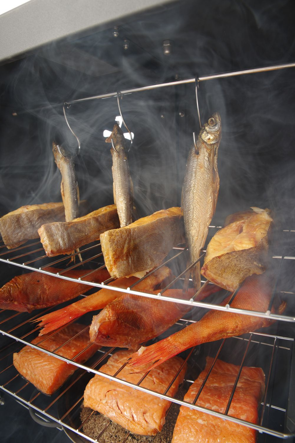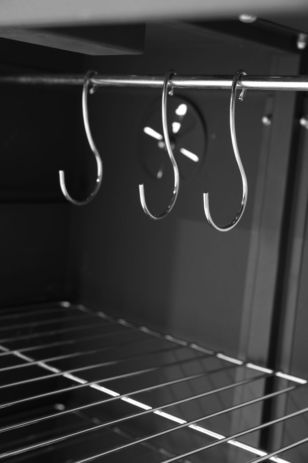Datorită celor trei rafturi cu dimensiuni de 40x27,9 cm fiecare, utilizatorul poate afuma simultan diferite produse sau cantități mai mari. În plus, setul conține cârlige pentru agățarea cărnii, ceea ce permite afumarea bucăților mai mari și crește flexibilitatea de utilizare a echipamentului. Orificiul de ventilație amplasat în partea din spate a cuptorului permite controlul circulației aerului, ceea ce duce la un gust și o aromă mai bună a preparatelor afumate.