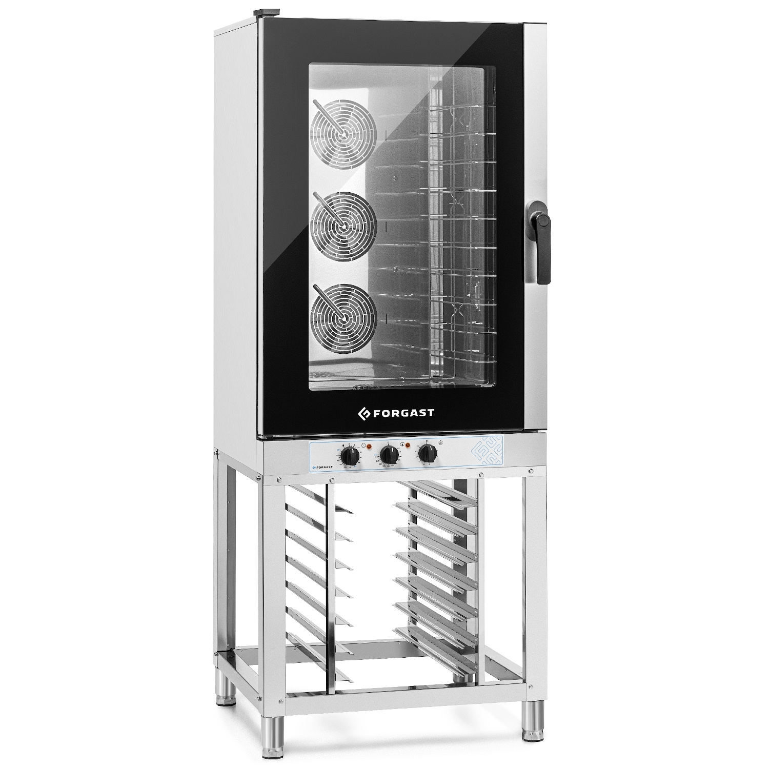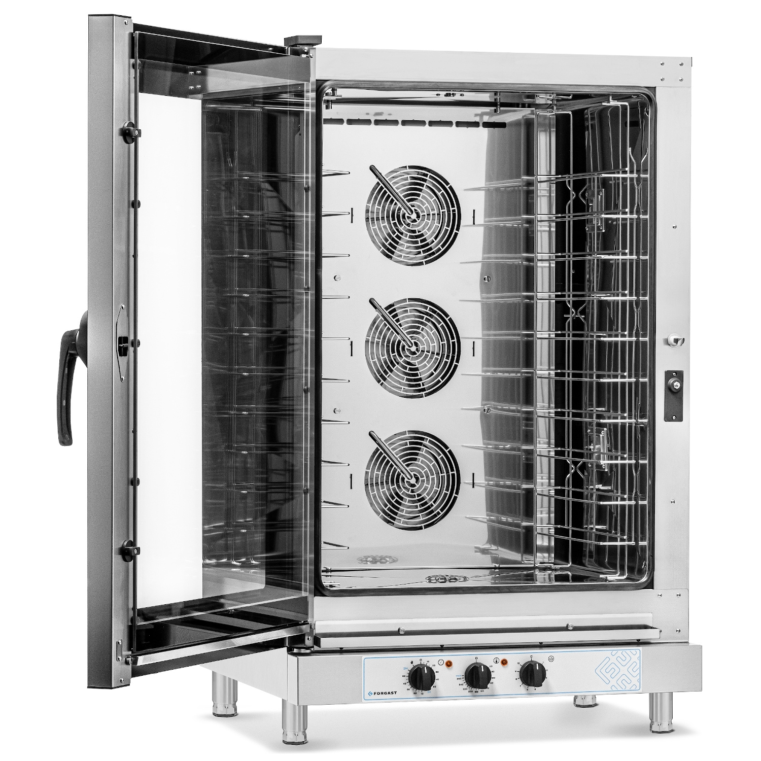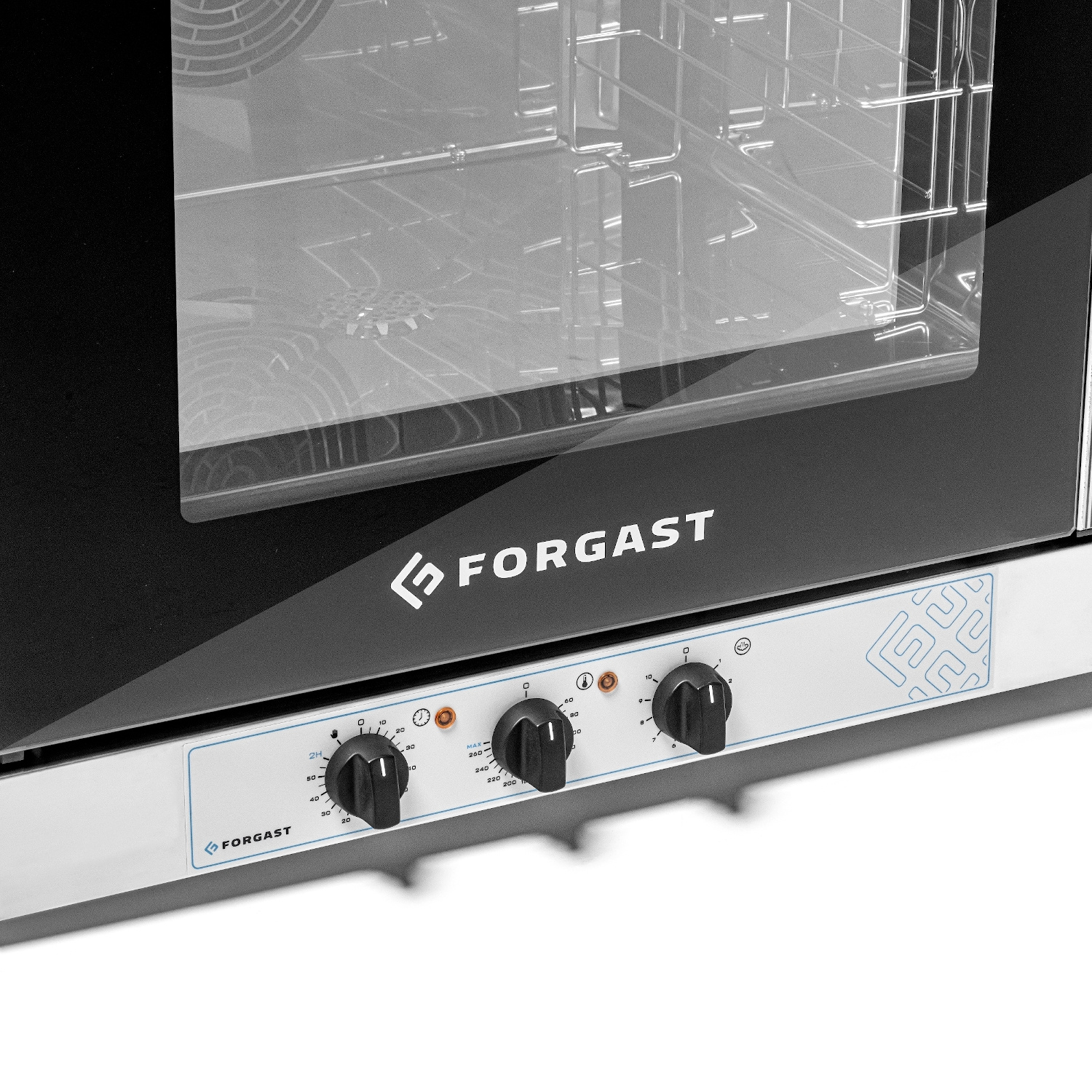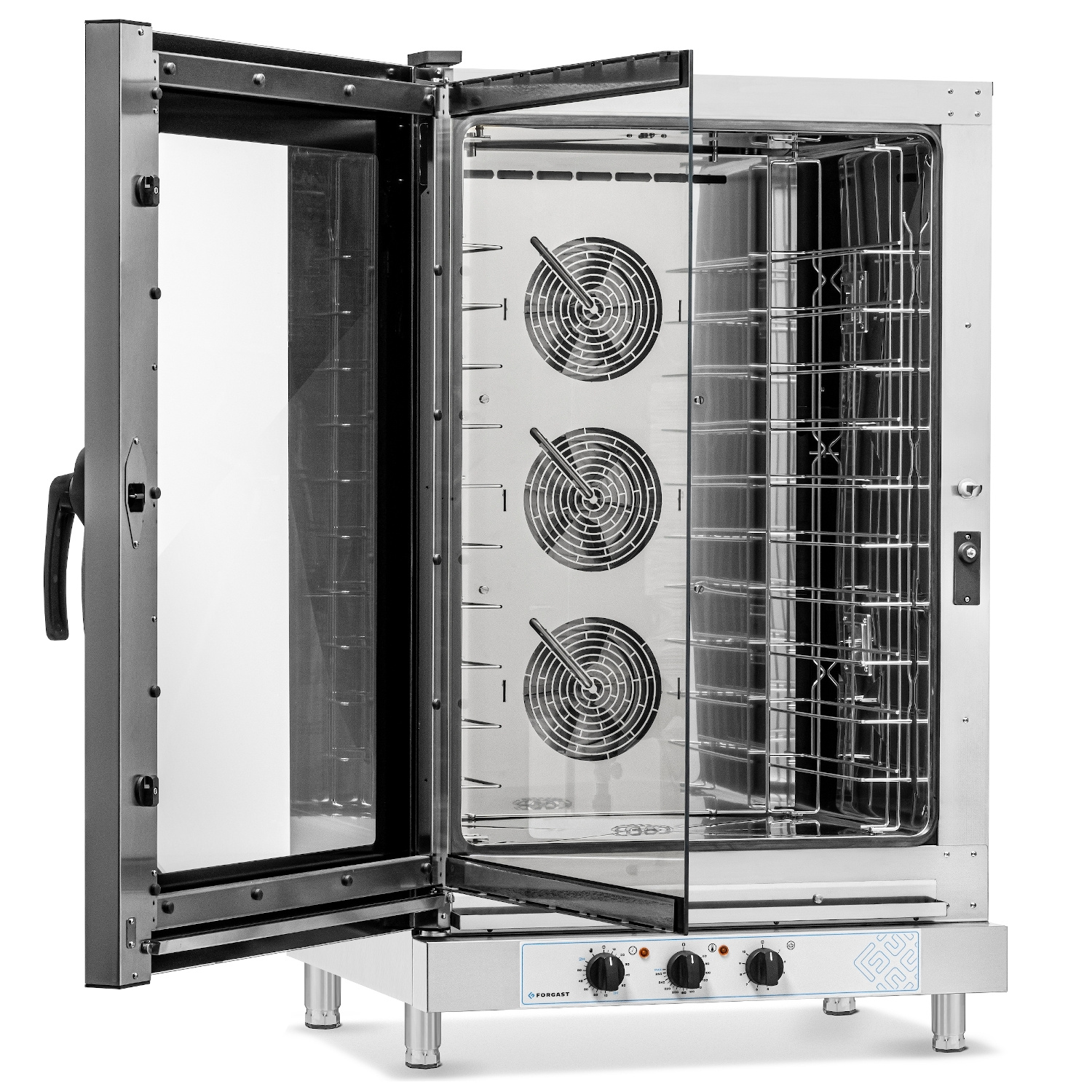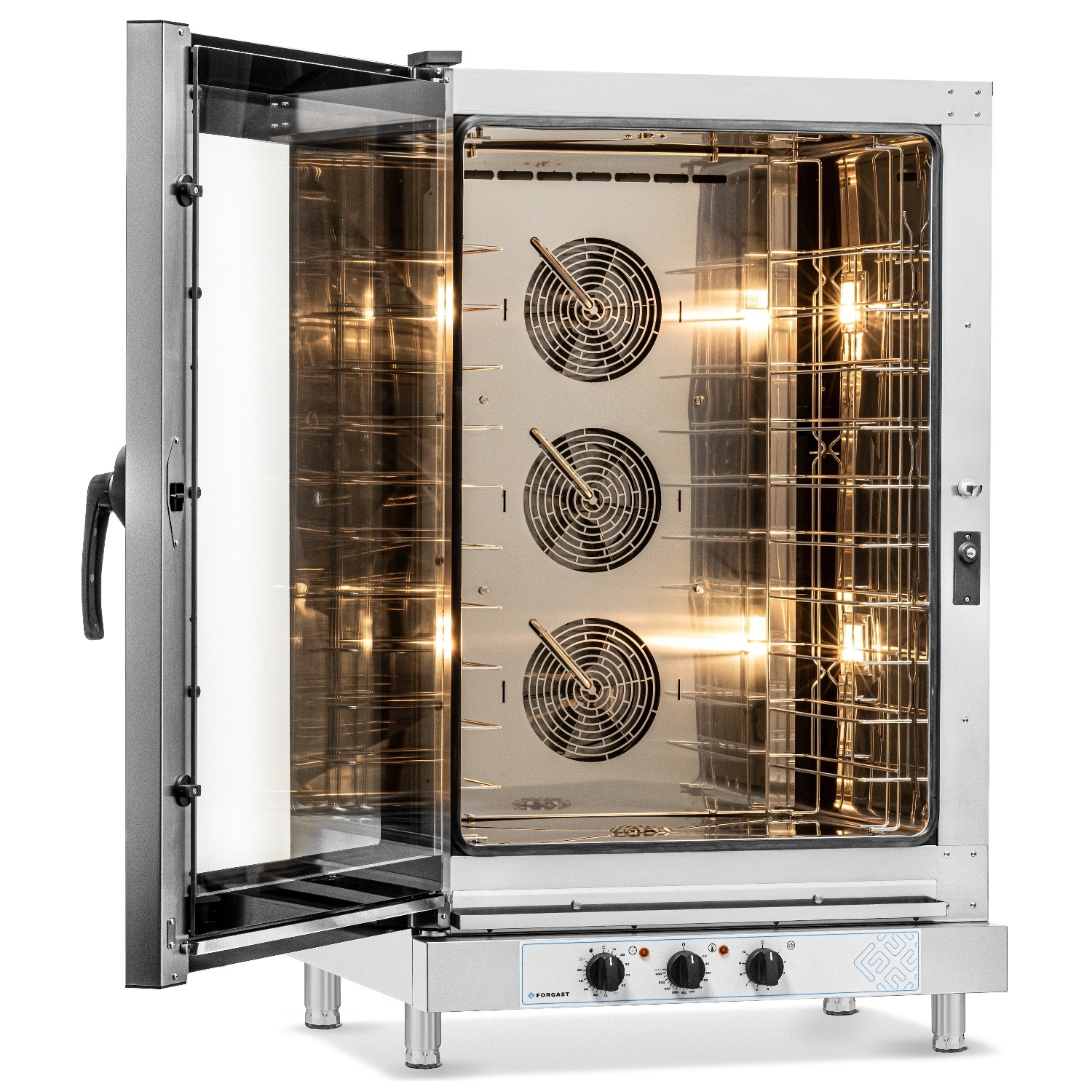 FORGAST FG09520 a fost proiectat având în vedere confortul și siguranța. Carcasa și interiorul sunt fabricate din oțel inoxidabil de înaltă calitate pentru a asigura o igienă ușoară și durabilitatea unității. Ușa cu geam dublu permite monitorizarea continuă a procesului de gătit fără a fi nevoie să deschideți cabinetul de gătit, ceea ce previne pierderea de căldură. Mânerul ergonomic de pe partea dreaptă îl face ușor de manevrat chiar și în medii de bucătărie aglomerate, iar iluminarea interioară cu halogen asigură o vizibilitate excelentă la toate nivelurile. Sistemul cu trei ventilatoare cu rotație reversibilă asigură distribuirea uniformă a căldurii, eliminând riscul ca mâncarea să nu fie suficient de gătită.