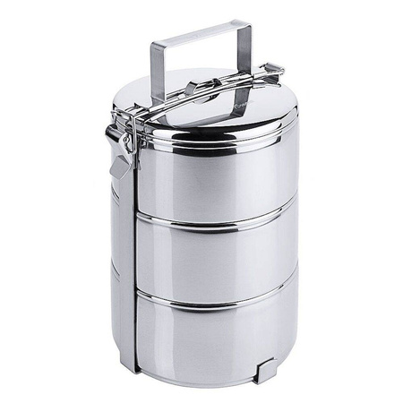 Recipient pentru alimente, 3 părți, cantină alimentară marca Contacto cu o capacitate de 3x0,9 litri. Ideal pentru transportul unei varietăți de alimente într-o formă convenabilă. Fabricat din oțel inoxidabil foarte lustruit. Include 3 recipiente cu capace și mânere.