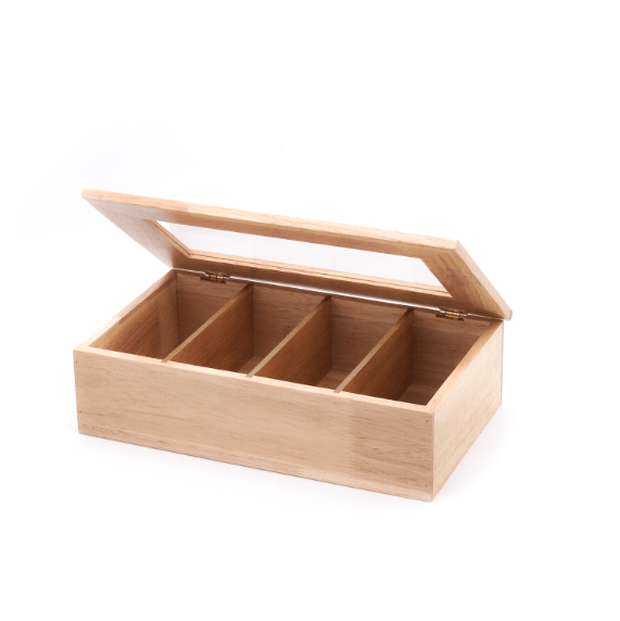 Cutia este realizată din lemn solid, într-o nuanță maro deschis, ceea ce îi conferă eleganță și durabilitate. Capacul transparent din acril este ușor și rezistent la deteriorări, permițând în același timp controlul comod al conținutului fără a deschide recipientul. Lipsa oricăror inscripții permite utilizarea liberă a cutiei după nevoile individuale.