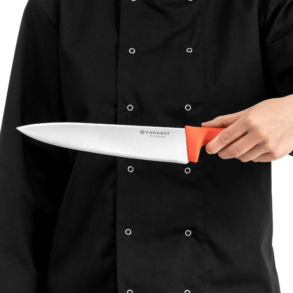 Cuțitul de bucătărie HACCP roșu, lungime 24 cm FORGAST FG01801 este un instrument profesional destinat preparării cărnii roșii în condiții gastronomice. Se remarcă printr-un mâner solid, ergonomic, realizat din polipropilenă de culoare roșie și o lamă precisă de 24 cm, care facilitează porționarea eficientă și igienică a diferitelor tipuri de carne. Produsul este conceput pentru a îndeplini standardele HACCP, ceea ce îl face alegerea ideală pentru bucătării profesionale, restaurante și unități de procesare alimentară.