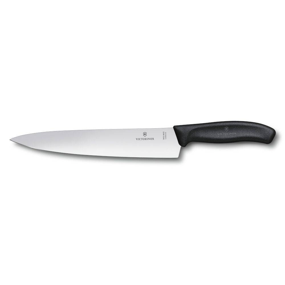 Cuțit de bucătărie universal cu mâner negru de la Victorinox. Este ideal atât pentru bucătăria de acasă, cât și pentru cea profesională. Potrivit pentru orice tip de carne, fructe și legume. Lama netedă de 22 cm lungime este realizată din oțel inoxidabil laminat, cu rezistență sporită, astfel încât cuțitul rămâne ascuțit pentru mult timp. Mânerul cuțitului este confecționat din material plastic (TPE) de culoare neagră. Forma ergonomică a mânerului asigură o prindere confortabilă, sporind confortul în utilizare. Cuțitul este potrivit pentru spălarea în mașina de spălat vase.