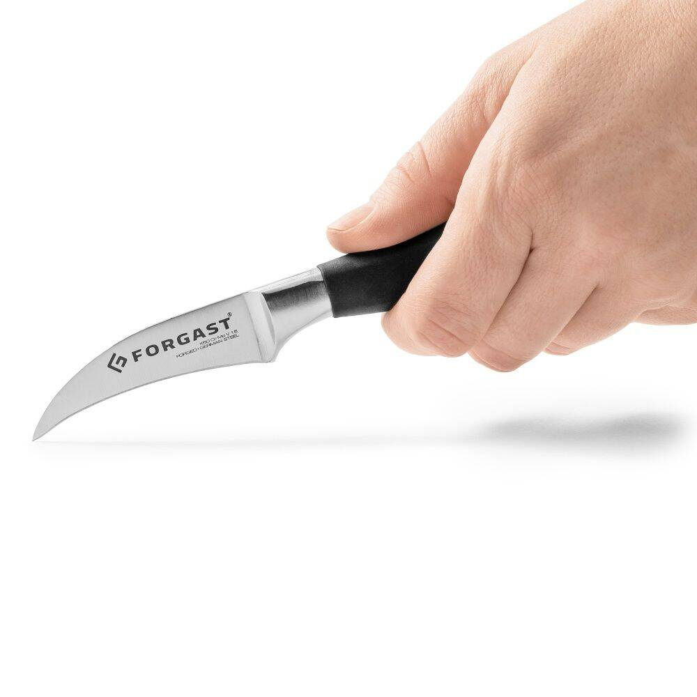 Cuțitul forjat pentru legume FORGAST FG11216 este o unealtă profesională destinată tăierii și prelucrării precise a legumelor. Construcția sa compactă și lama cu o lungime de 6,5 cm fac ca acest cuțit să fie ideal atât pentru bucătăriile casnice, cât și pentru gastronomia profesională. Se caracterizează printr-o rezistență ridicată la uzură și un mâner ergonomic, care oferă confort și siguranță în utilizare, chiar și în timpul folosirii îndelungate.