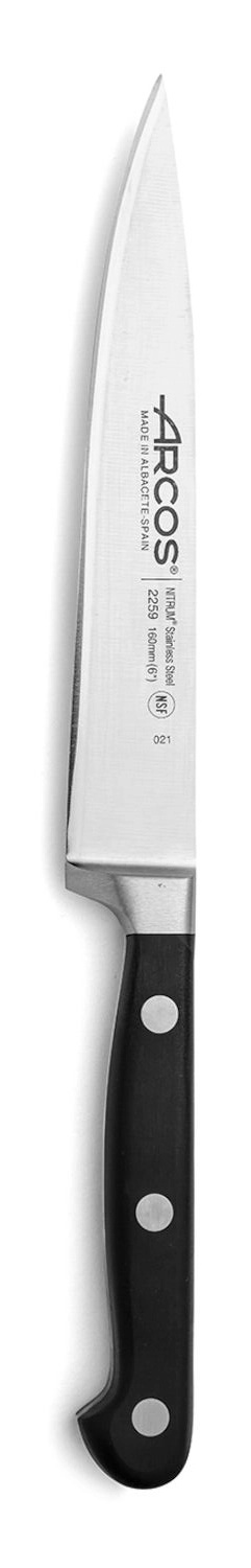 Cuțit de filetat din seria ÓPERA de la Arcos este o unealtă de precizie creată pentru filetat diferite tipuri de carne și pește. Fabricat în Spania, acest cuțit se remarcă prin lama realizată din oțel inoxidabil inovator NITRUM®, care asigură o duritate sporită și rezistență la coroziune. Marginea de tăiere „silk edge” face ca fiecare tăietură să fie extrem de fină și precisă, permițând separarea ușoară și exactă a cărnii de os. Lama cuțitului este forjată dintr-o singură bucată de oțel, garantând durabilitate și stabilitate în timpul utilizării. Mânerul perfect echilibrat, realizat din material durabil POM și fixat cu nituri din oțel inoxidabil, oferă o priză confortabilă și ușurință în utilizare. Profilarea suplimentară pentru protecția degetelor crește siguranța în timpul filetării.