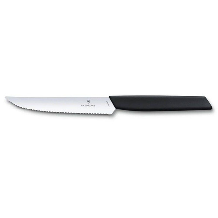 Cuțit pentru steak de la Victorinox. Ideal atât pentru restaurante, cât și pentru uz casnic. Proiectat pentru tăierea steak-urilor și coastelor. Lama zimțată, cu o lungime de 12 cm, este realizată din oțel inoxidabil întărit, ceea ce face ca cuțitul să rămână ascuțit pentru mult timp. Mânerul modern este realizat din polipropilenă (PPC) de culoare neagră. Cuțitul se remarcă printr-un aspect modern și estetic. Lungimea totală a cuțitului este de 23,2 cm. Cuțitul este potrivit pentru spălarea în mașina de spălat vase.