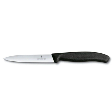 Cuțit pentru legume cu mâner negru de la Victorinox. Ideal pentru curățarea legumelor și fructelor. Lama cu o lungime de 10 cm este realizată din oțel inoxidabil laminat cu rezistență sporită, ceea ce face ca lama să rămână ascuțită pentru mult timp. Mânerul cuțitului este fabricat din polipropilenă de culoare neagră. Forma ergonomică a mânerului asigură o prindere confortabilă și îmbunătățește confortul în utilizare. Cuțitul este potrivit pentru spălarea în mașina de spălat vase.