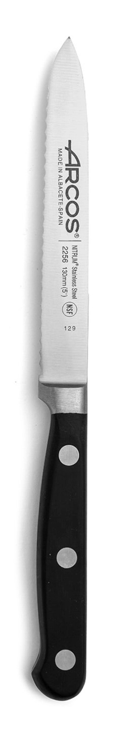 Cuțit pentru roșii din seria ÓPERA de la Arcos este un instrument de precizie proiectat special pentru felierea legumelor și fructelor delicate, precum roșiile. Echipat cu o lamă zimțată, acest cuțit face față perfect cojii tari a fructelor, menținând în același timp interiorul delicat intact. Lama este realizată din oțel inoxidabil inovator NITRUM®, care oferă o duritate crescută și rezistență la coroziune, ceea ce se traduce printr-o durată de viață îndelungată și fiabilitate. Datorită marginii de tăiere silk edge, cuțitul asigură o precizie excepțională la tăiere, iar mânerul confortabil și perfect echilibrat, realizat din material durabil POM, garantează confort în utilizare. Mânerul este fixat de lamă cu ajutorul unor nituri din oțel inoxidabil, ceea ce întărește suplimentar construcția cuțitului, iar profilarea care protejează degetele sporește siguranța în timpul folosirii.