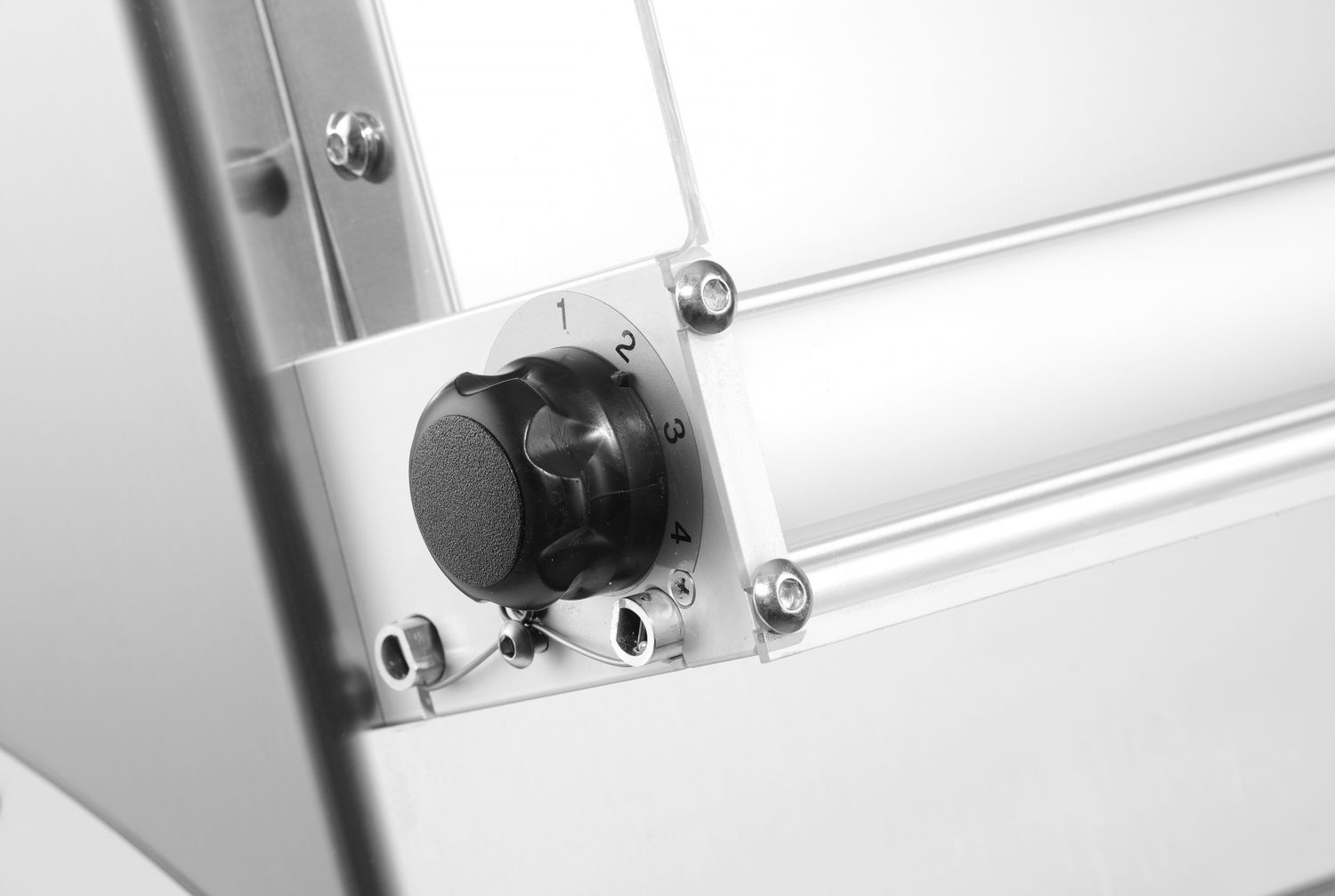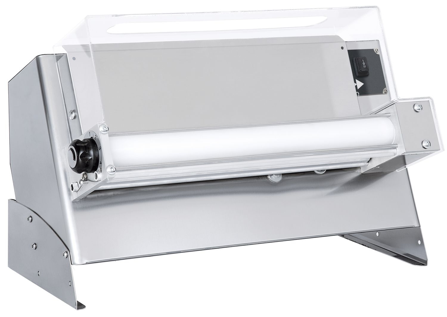 Dispozitiv electric pentru formarea pizzei (aparat de întins aluatul) fabricat din oțel inoxidabil. Buton electric de picior. Dispozitivul este ideal pentru întinderea aluatului rece pentru pizza, colțunași și paste. Aparatul dispune de un comutator automat „Touch and go”, datorită căruia începe să funcționeze automat după introducerea aluatului. Timpul de lucru poate fi setat între 10 și 35 de secunde. Rolele permit reglarea grosimii aluatului între 0-5 mm. Fiecare rolă are propriul său capac pentru a crește siguranța în muncă. Se pot forma pizze cu diametrul de la 26 până la 45 cm. Capacele rolelor asigură o muncă sigură. Cantitatea de aluat: între 0,21 și 0,7 kg.