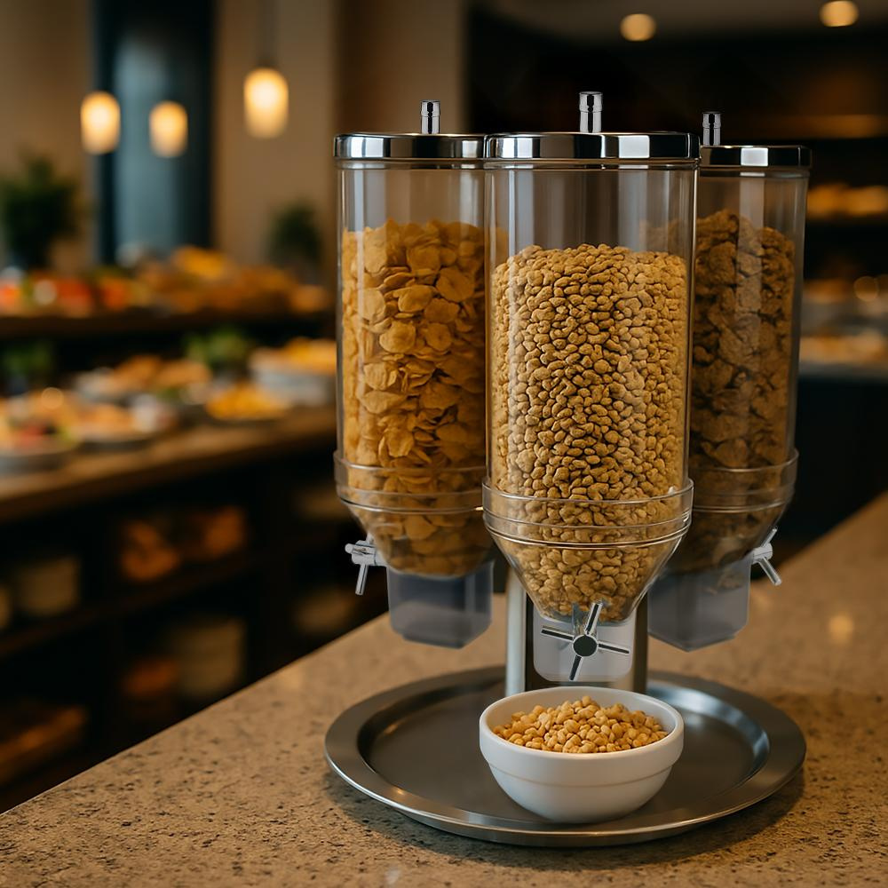Dozatorul ROTATION este ideal pentru sălile de mic dejun din hoteluri, restaurante, bufete și alte locuri unde contează atât confortul servirii, cât și estetica prezentării. Permite dozarea igienică și economică a cerealelor, musli-ului, fructelor uscate sau nucilor. Capacitatea mare și construcția solidă îl fac soluția perfectă pentru spațiile cu trafic intens.