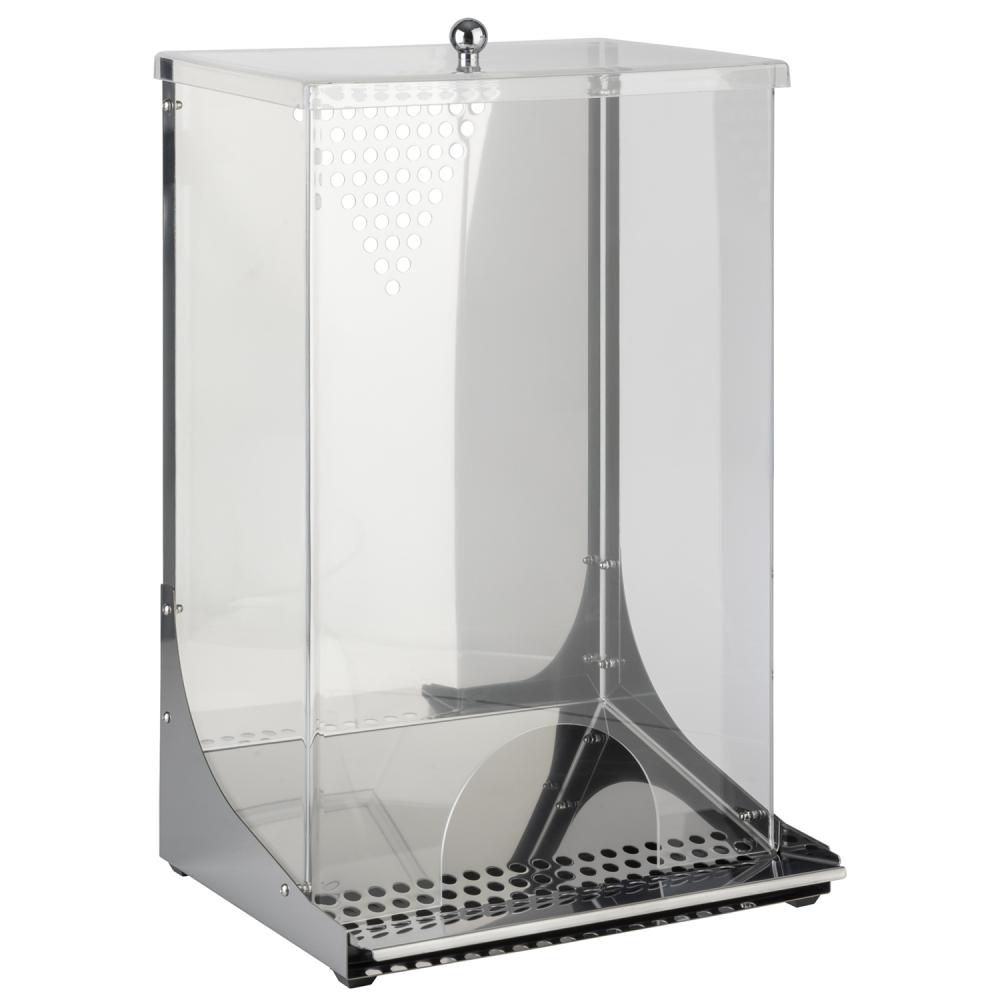 Construcția dozatorului se bazează pe o bază solidă din oțel inoxidabil și pereți transparenți din acril, care permit prezentarea conținutului. În partea inferioară se află o tavă practică pentru firimituri, care facilitează menținerea curățeniei. Forma dreptunghiulară permite utilizarea maximă a spațiului de pe blat.