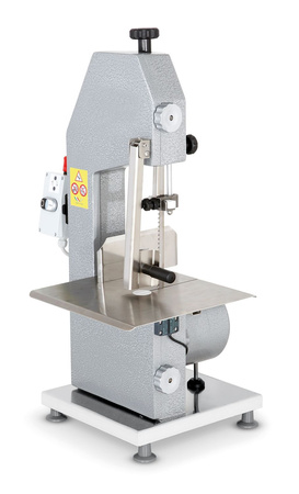Ferăstrău electric pentru oase. Corp din aluminiu lăcuit și părți în contact cu carnea din oțel inoxidabil. Caracteristicile suplimentare includ un buton de oprire de urgență, o frână a motorului și un microcomutator pentru închiderea carcasei. Unitatea este reglabilă în grosime și înălțime de tăiere.