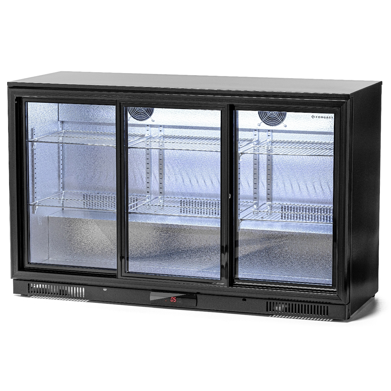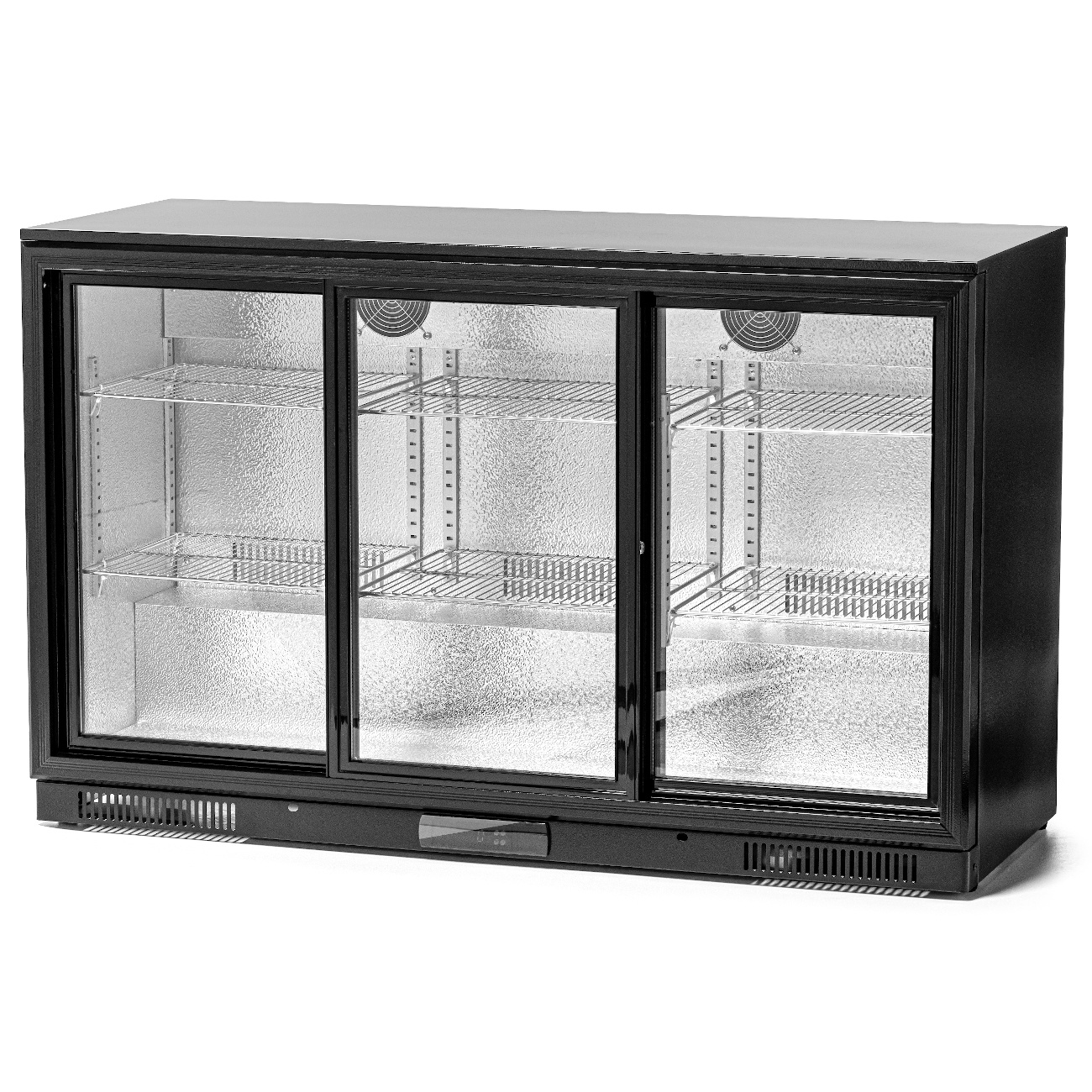 Acest frigider de bar a fost proiectat pentru localuri cu utilizare intensivă, precum puburi, cluburi de noapte, restaurante sau hoteluri. Cele trei uși glisante permit accesul ușor la băuturi chiar și în perioadele de vârf la bar. Carcasa din oțel negru îi conferă un aspect modern, care se potrivește cu diverse amenajări interioare. Interiorul din aluminiu asigură curățarea ușoară, iar geamurile duble ale ușilor sporesc siguranța și reduc pierderile de energie. Încuietoarea integrată este utilă în locurile unde este necesară protejarea conținutului împotriva accesului neautorizat.
