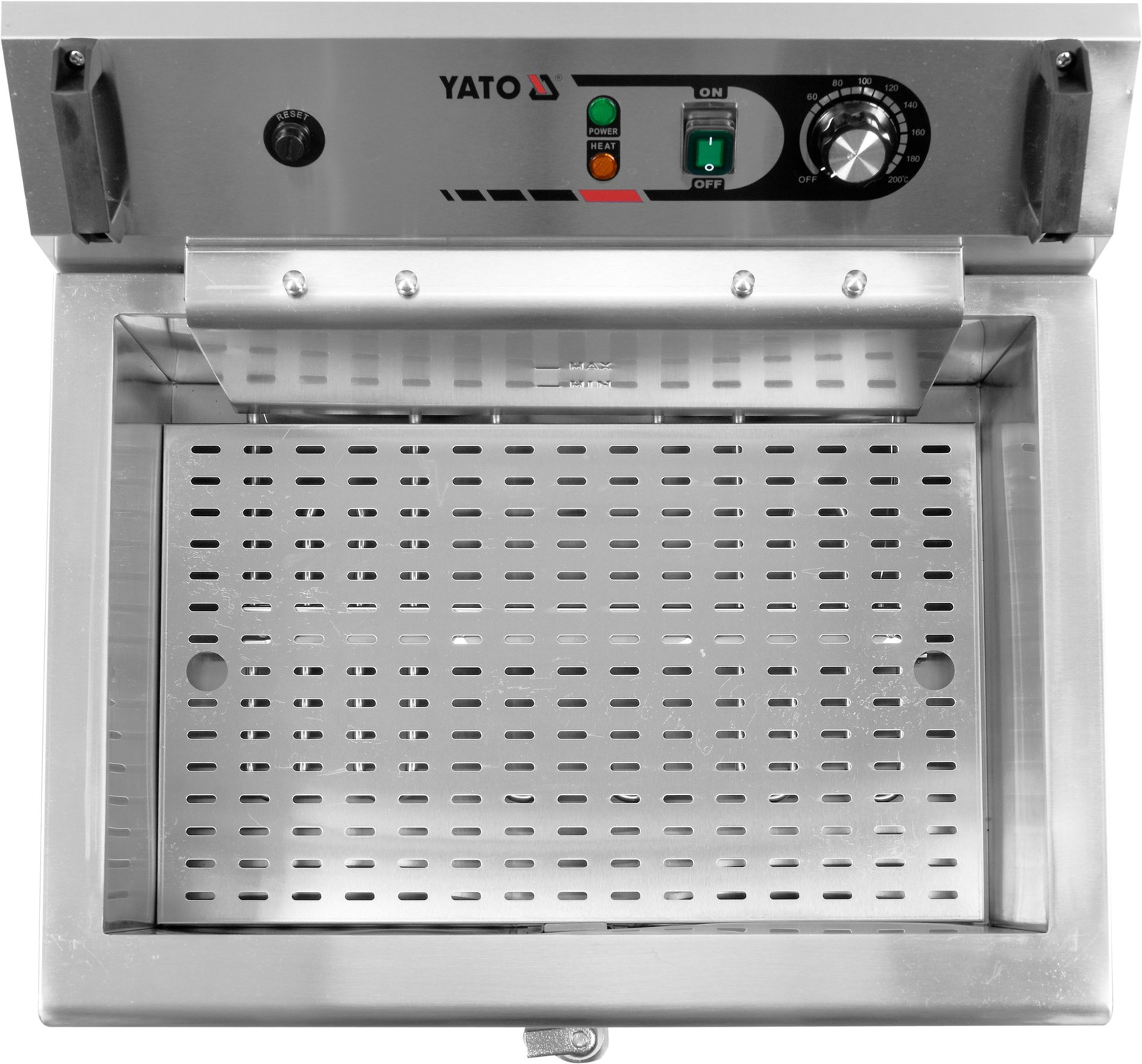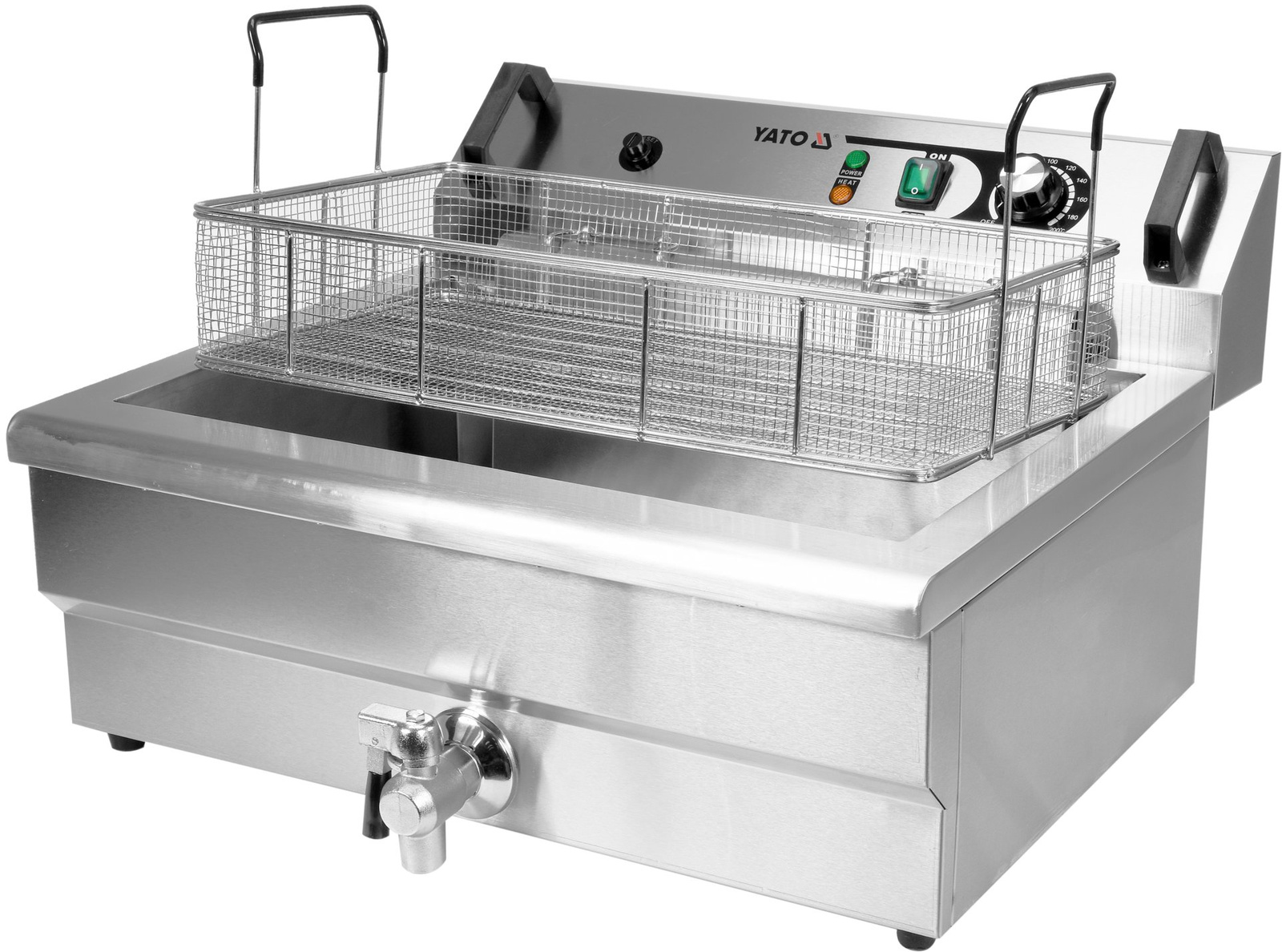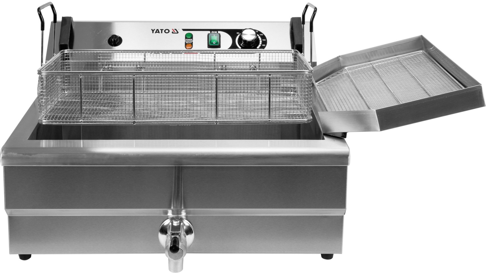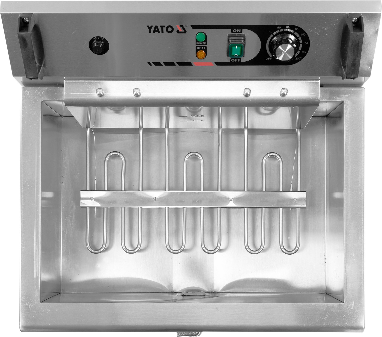 Frigider electric YATO YG-04640 - pentru prăjirea produselor precum carne, pește, legume, gogoși și crochete. Capacitatea totală de umplere a rezervorului friteuzei este de 30 l - nivelul minim al uleiului este de 17 l și cel maxim de 23 l .Frigiderul are un încălzitor de 6,0 kW, care este controlat de un potențiometru pe panoul de control. Temperatura de funcționare 60oC -200oC.Datorită comutatorului rezistent la stropire, unitatea poate fi oprită fără a deconecta cablul de alimentare de la rețea.
